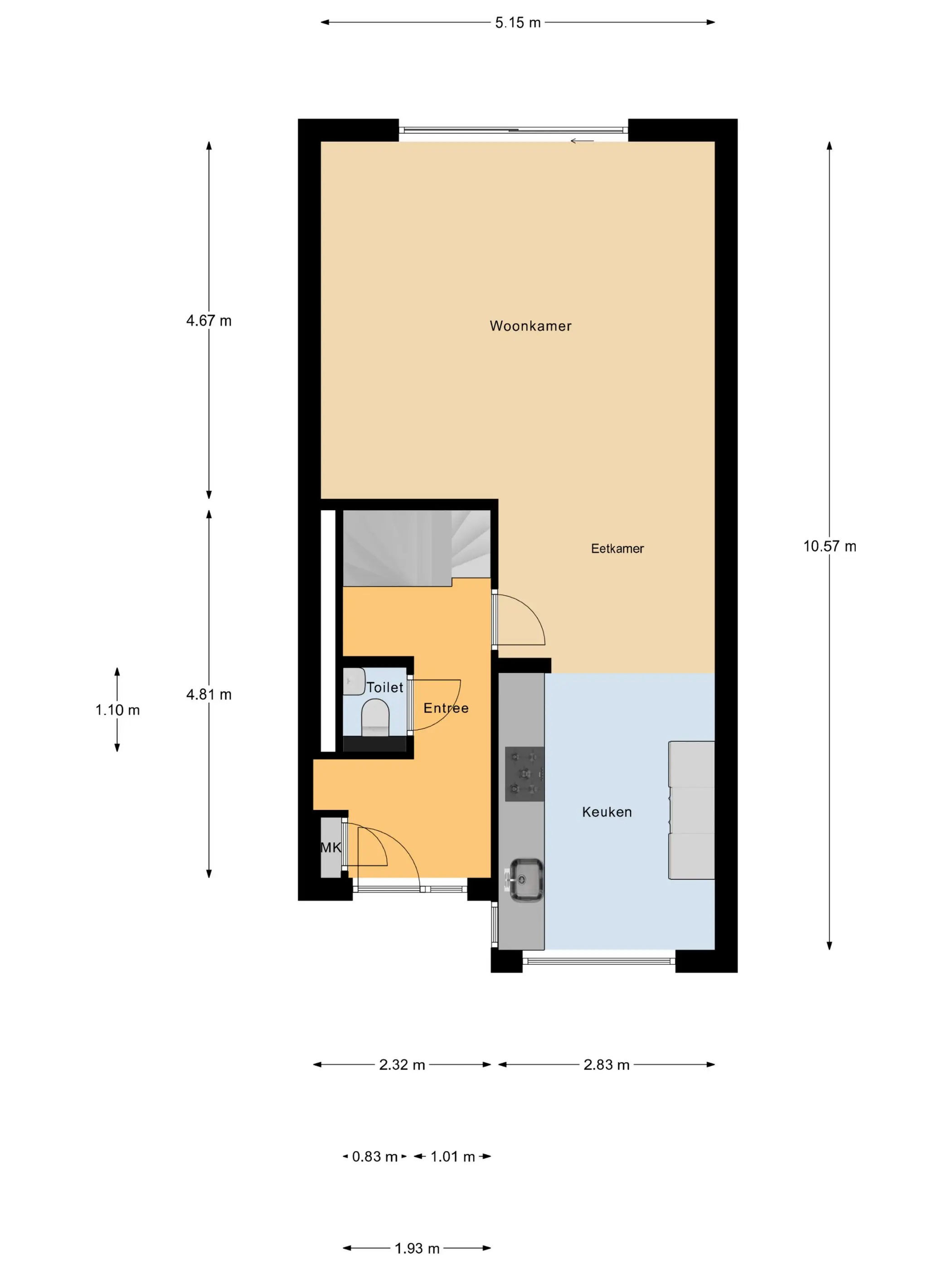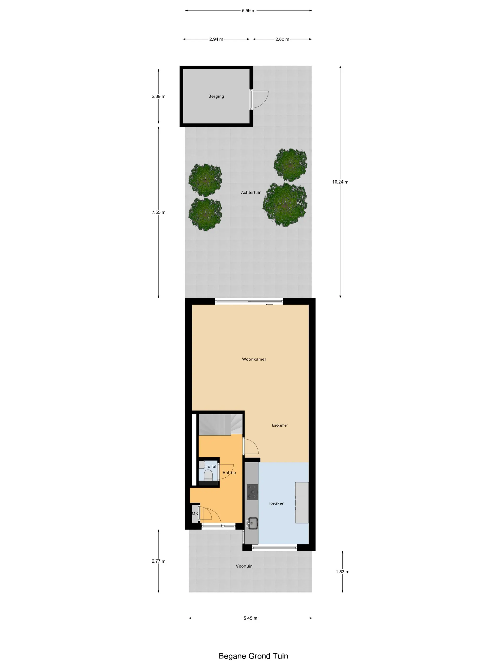 Begane grond: Binnenkomst in de lichte hal met modern zwevend toilet, meterkast en trapopgang. De tuingerichte woonkamer is voorzien van houten vloerdelen, airco en een brede kunststof schuifpui naar de diepe, zonnige achtertuin op het zuiden. Hier vind je een stenen berging en een praktische achterom.