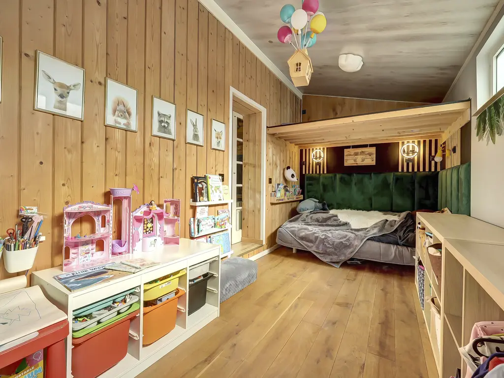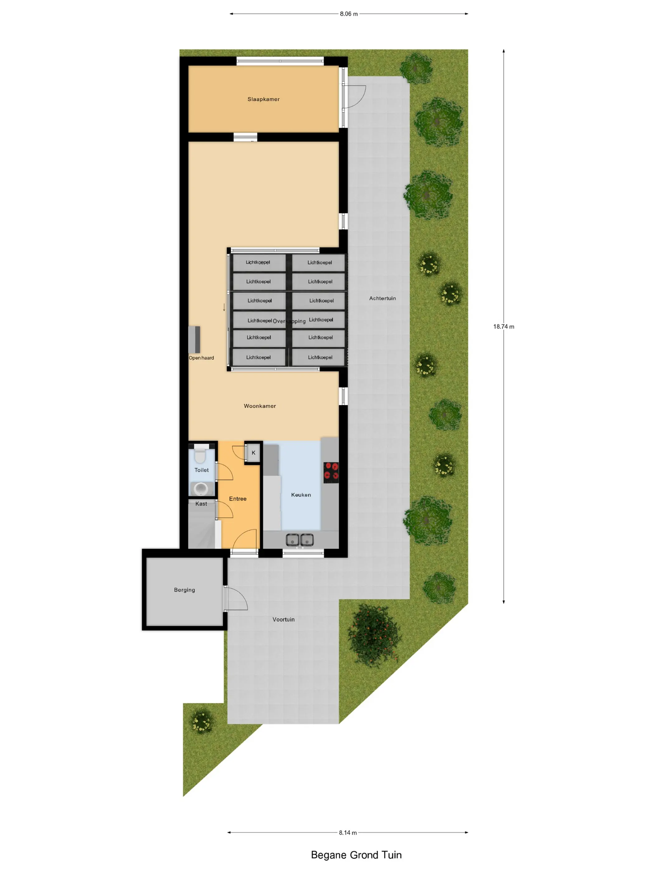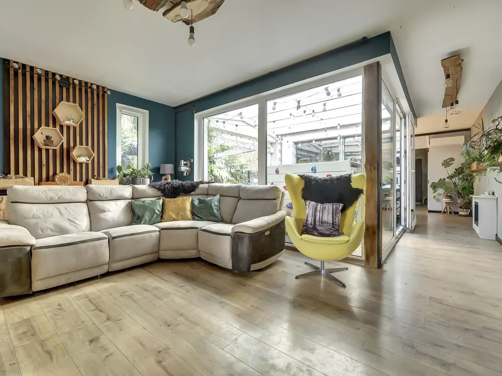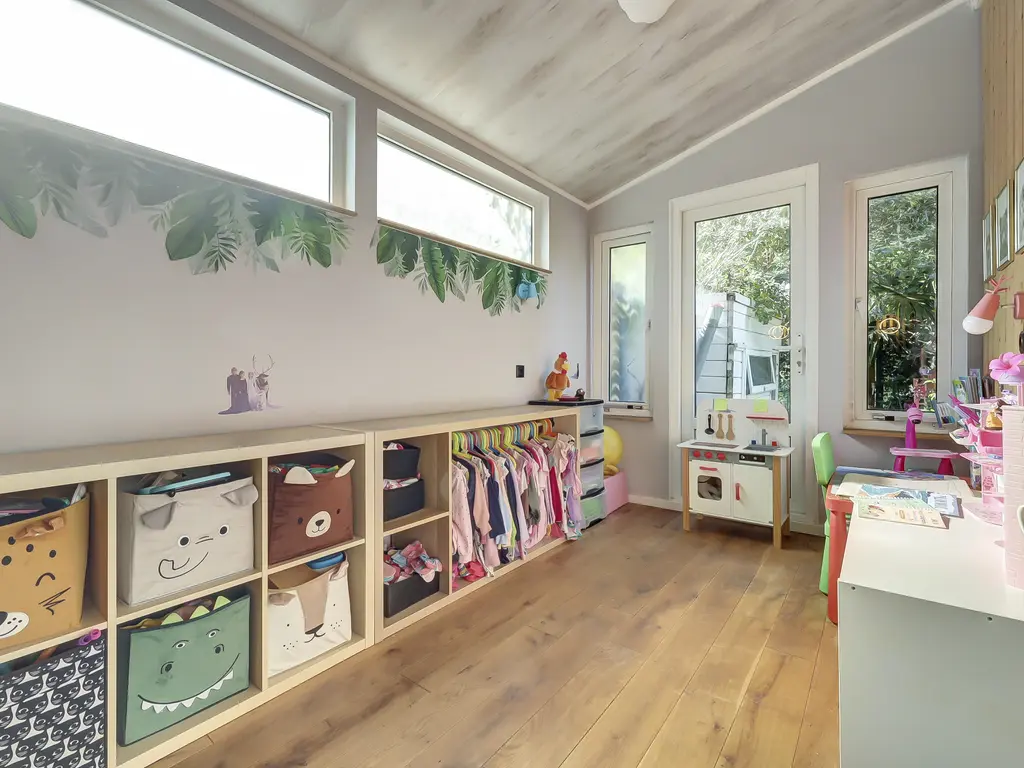 Vanuit de tussenhal heeft u toegang tot de gezellige patio en de lichte woonkamer aan de achterzijde van de woning. Hier grenst ook de extra (slaap-/werk-/speel)kamer met directe toegang tot de tuin, waar u kunt genieten van het uitzicht op het aangrenzende groen.