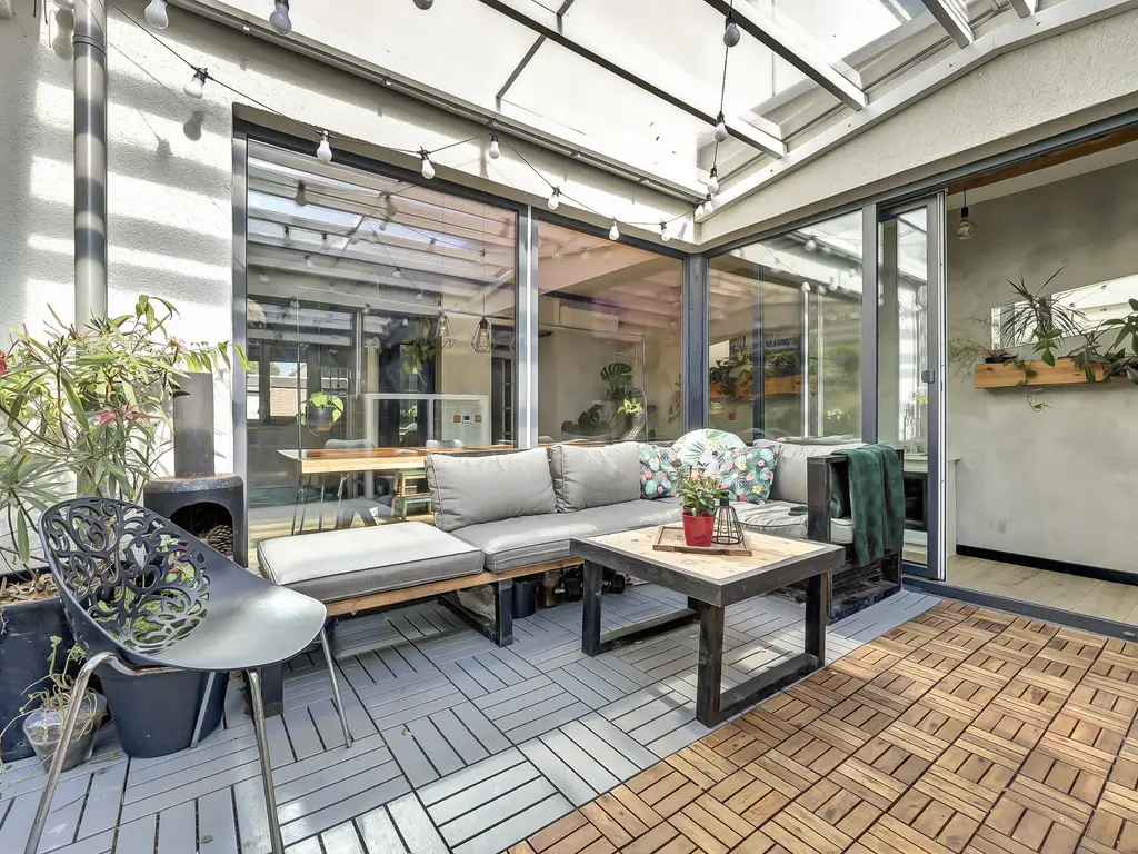 Overdekte patio grenzend aan de tuin met vrij uitzicht op groen
