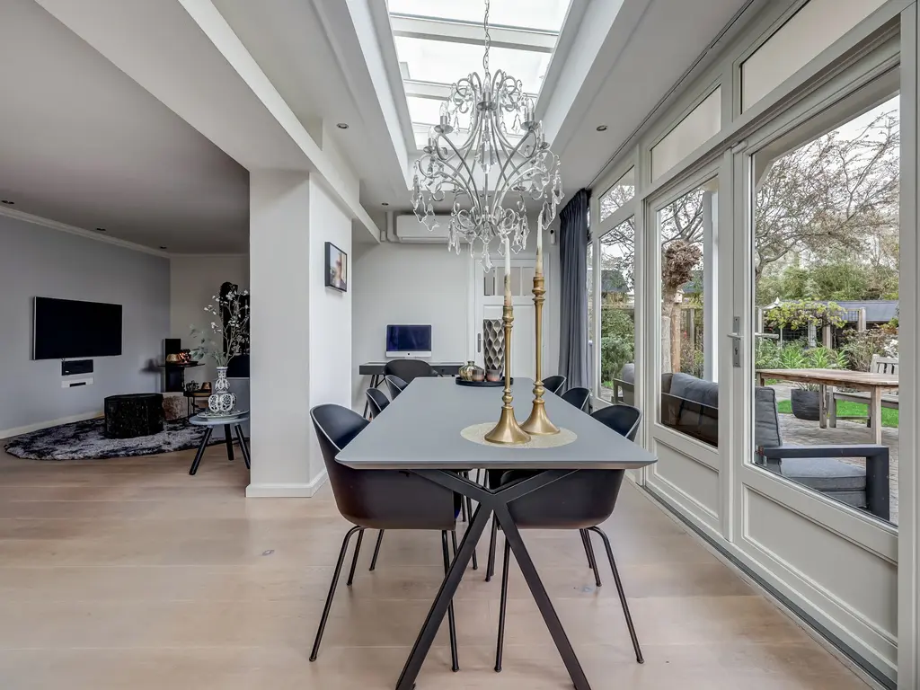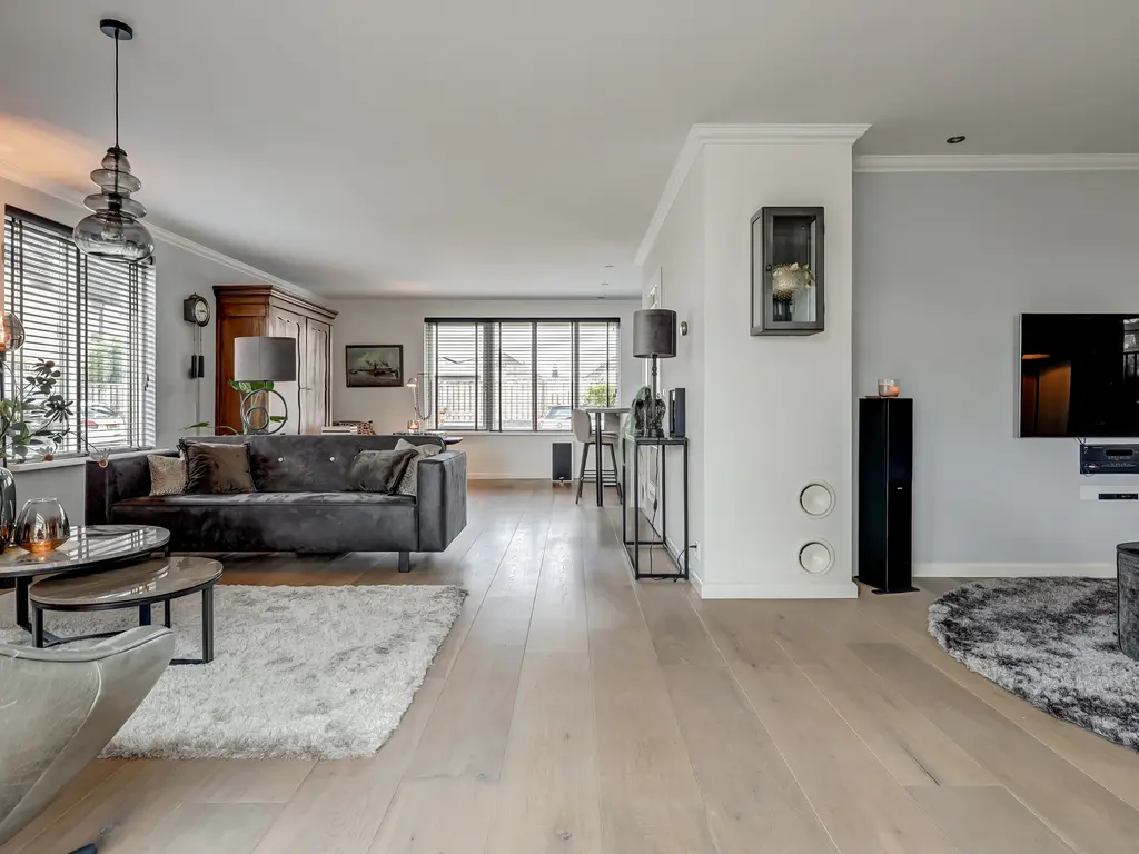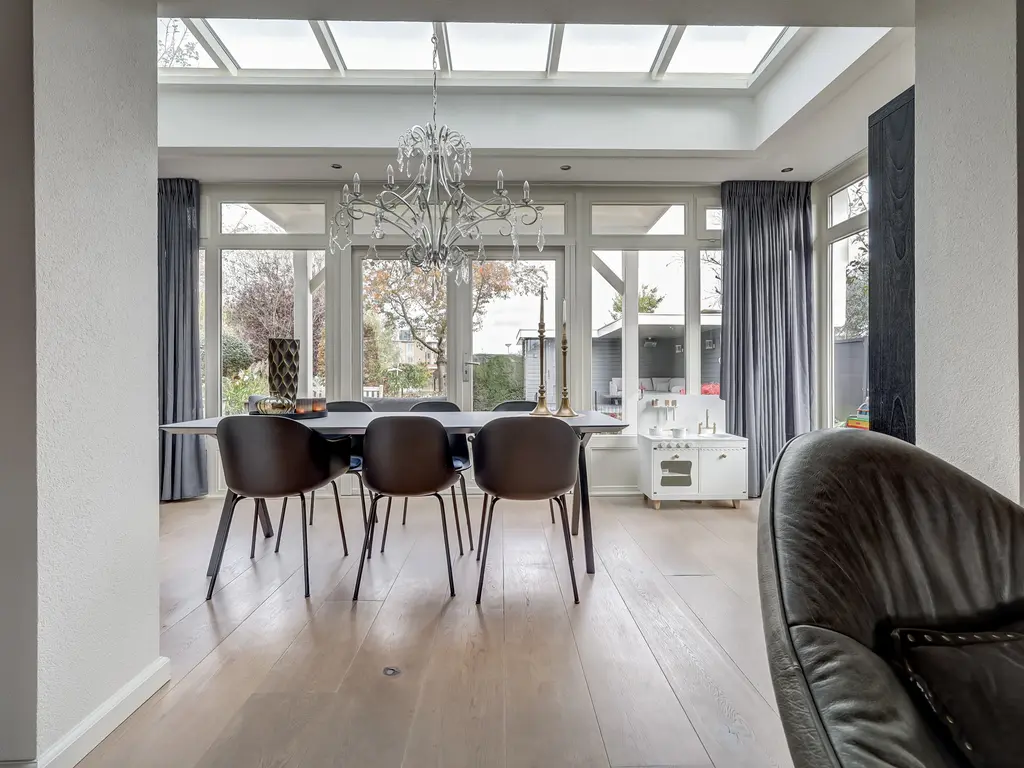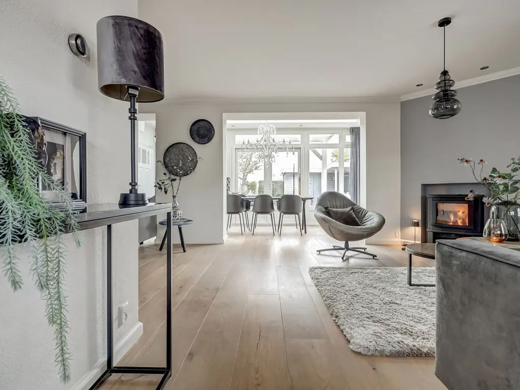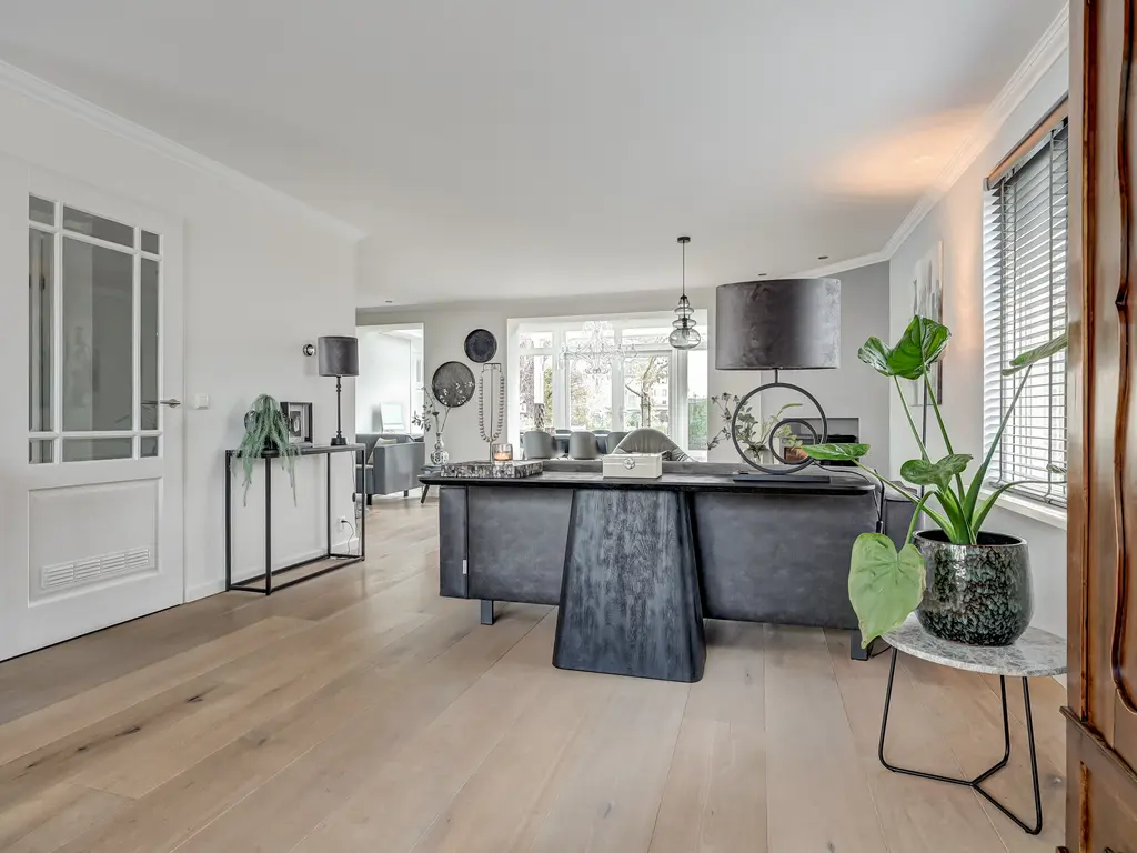 De gehele begane grond is voorzien van een fraaie houten vloer en strak gestuukte wanden en plafonds. Vanuit de serre bereik je de praktische bijkeuken en de ruime garage.