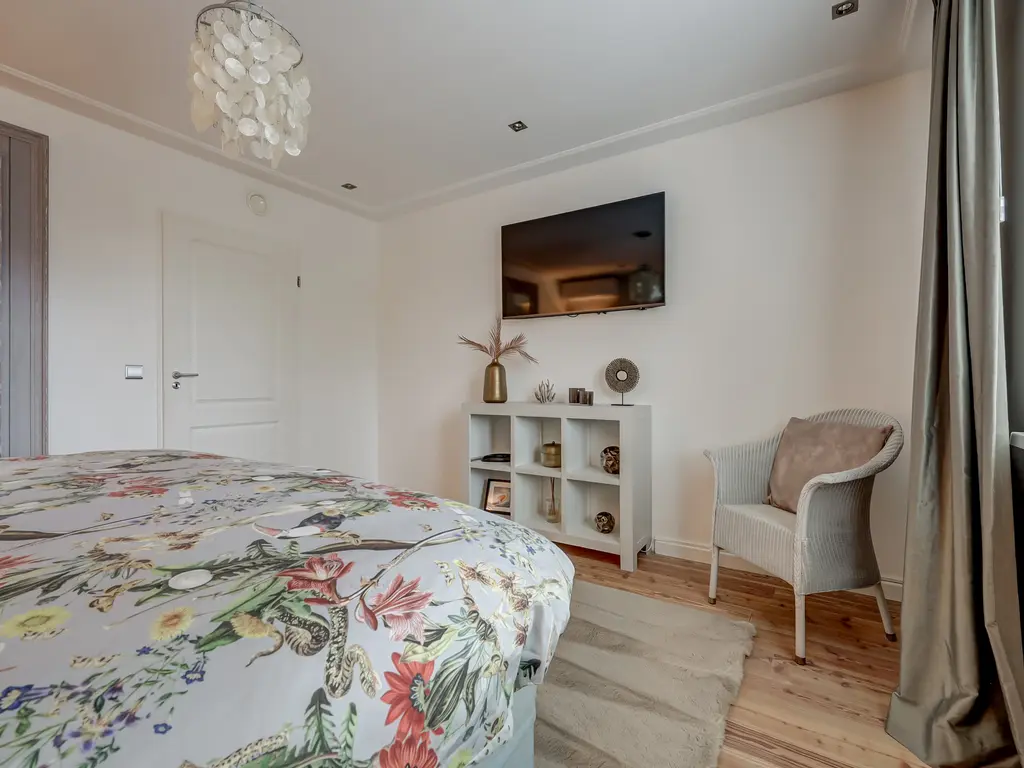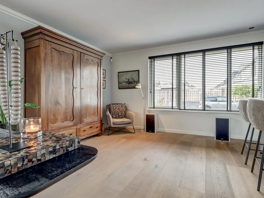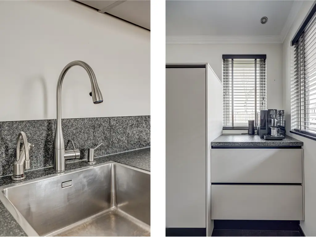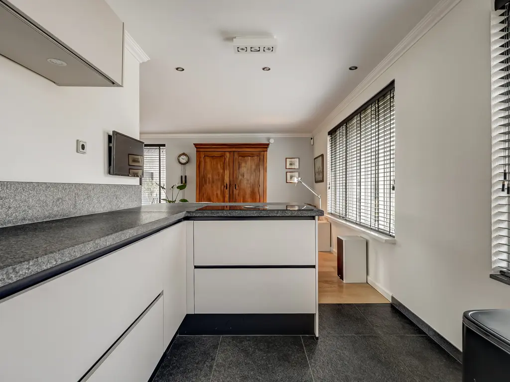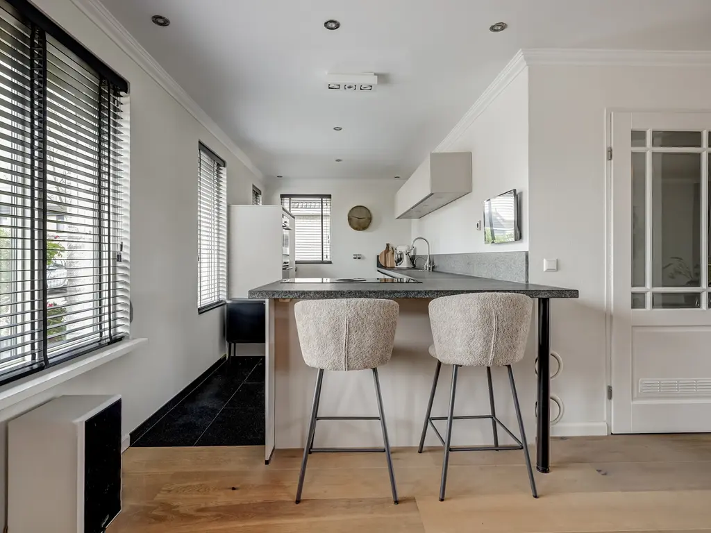 Aan de voorzijde bevindt zich de moderne keuken met dubbele wandopstelling en een gezellige eetbar. De keuken is volledig uitgerust met een inductiekookplaat met geïntegreerde afzuiging, vaatwasser, koelkast, vriezer, een zgan stoomoven en een combi-oven met magnetronfunctie, ideaal voor de kookliefhebber.