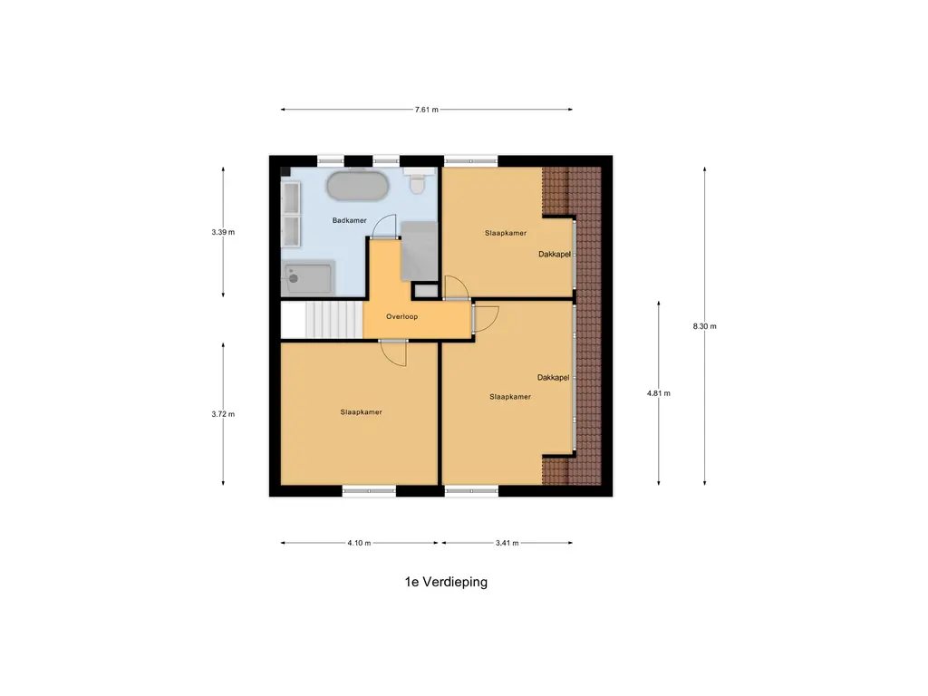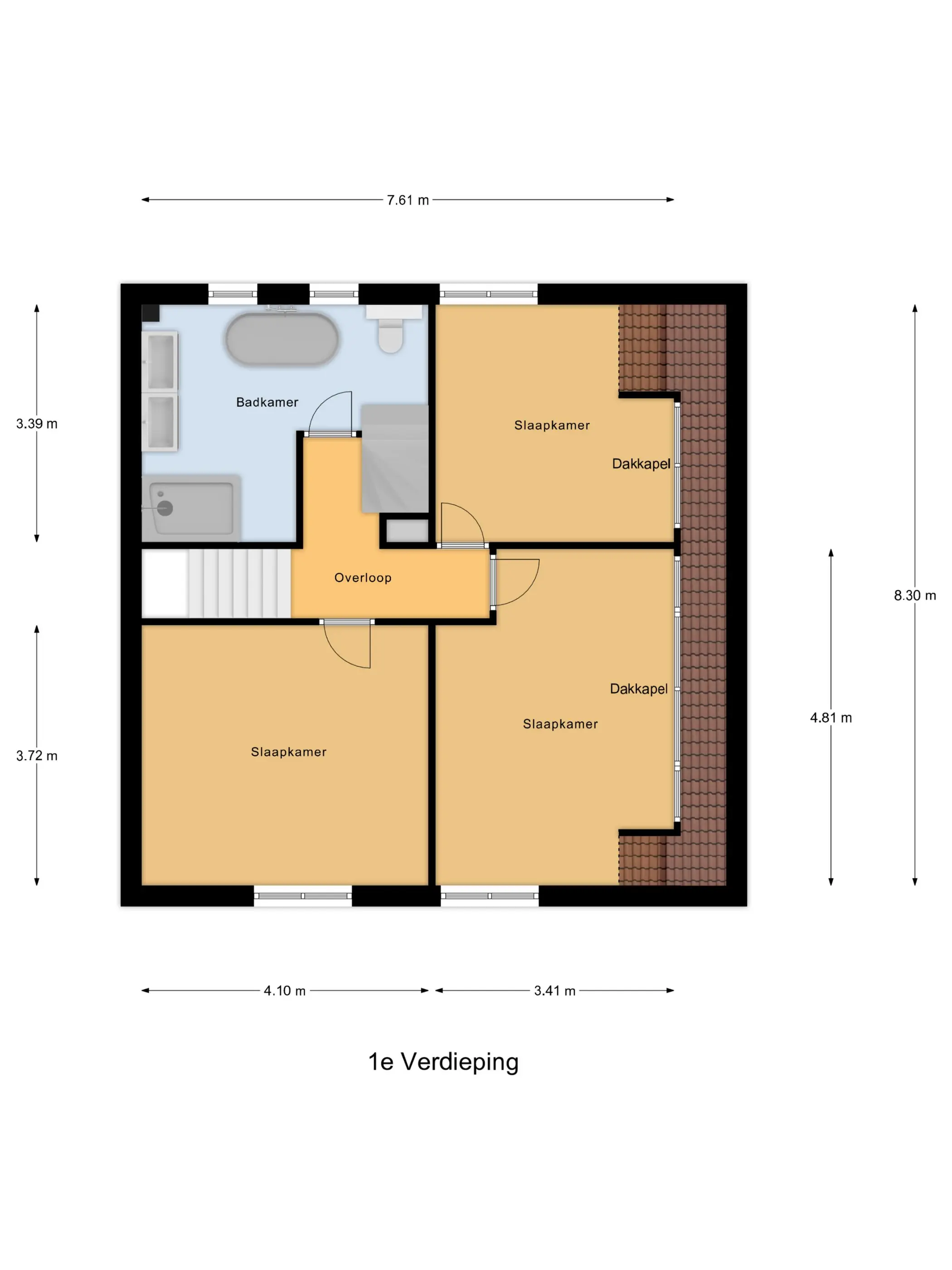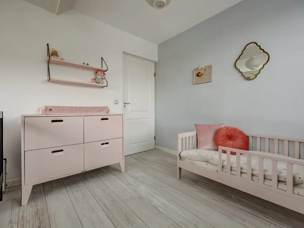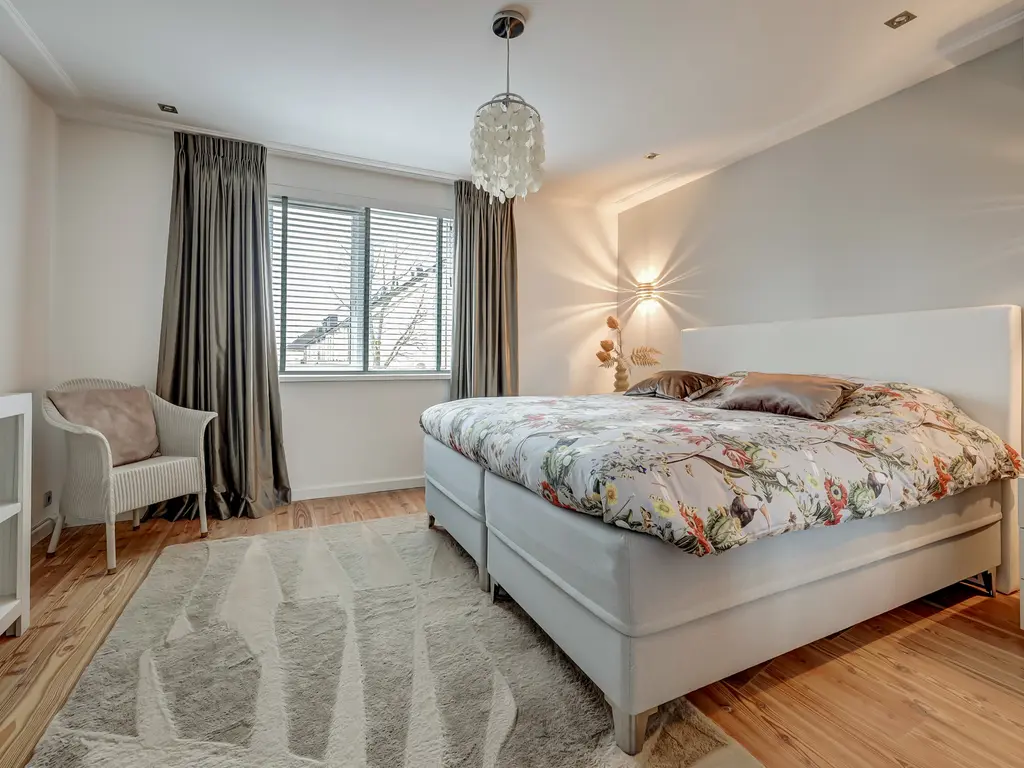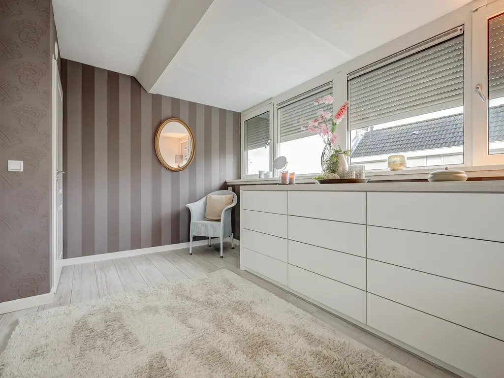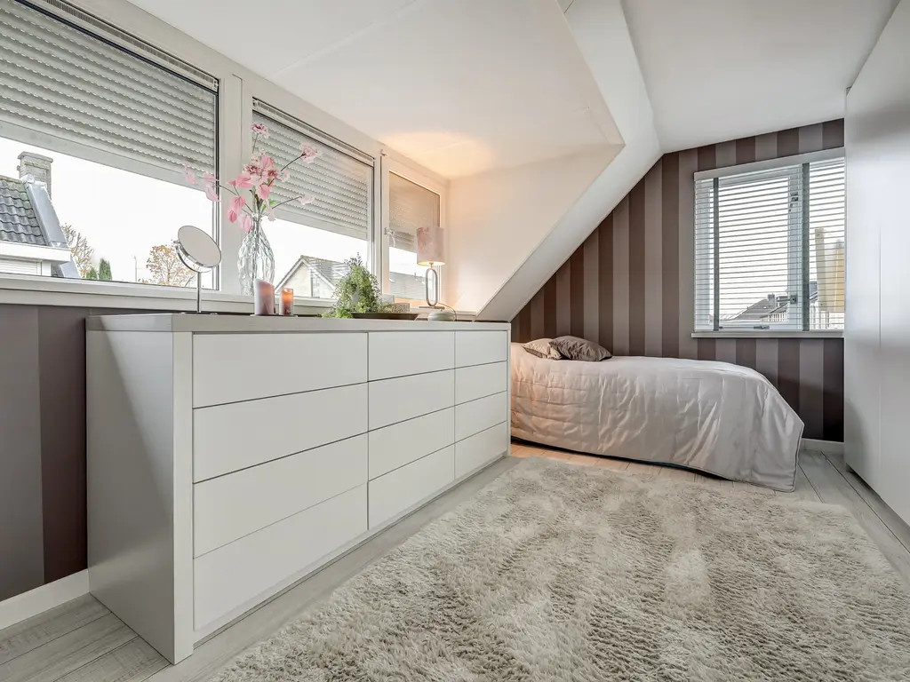 Eerste verdieping: De overloop biedt toegang tot drie ruime slaapkamers, allen keurig afgewerkt. De hoofdslaapkamer is voorzien van airconditioning, een gestuukt plafond met sierrand en biedt een prettige, luxe uitstraling. In de tweede slaapkamer is een praktische garderobe ingericht met vijf hang-/legkasten en twaalf lades, een droom voor wie van opbergruimte houdt. De derde kamer beschikt eveneens over een dakkapel met rolluiken.