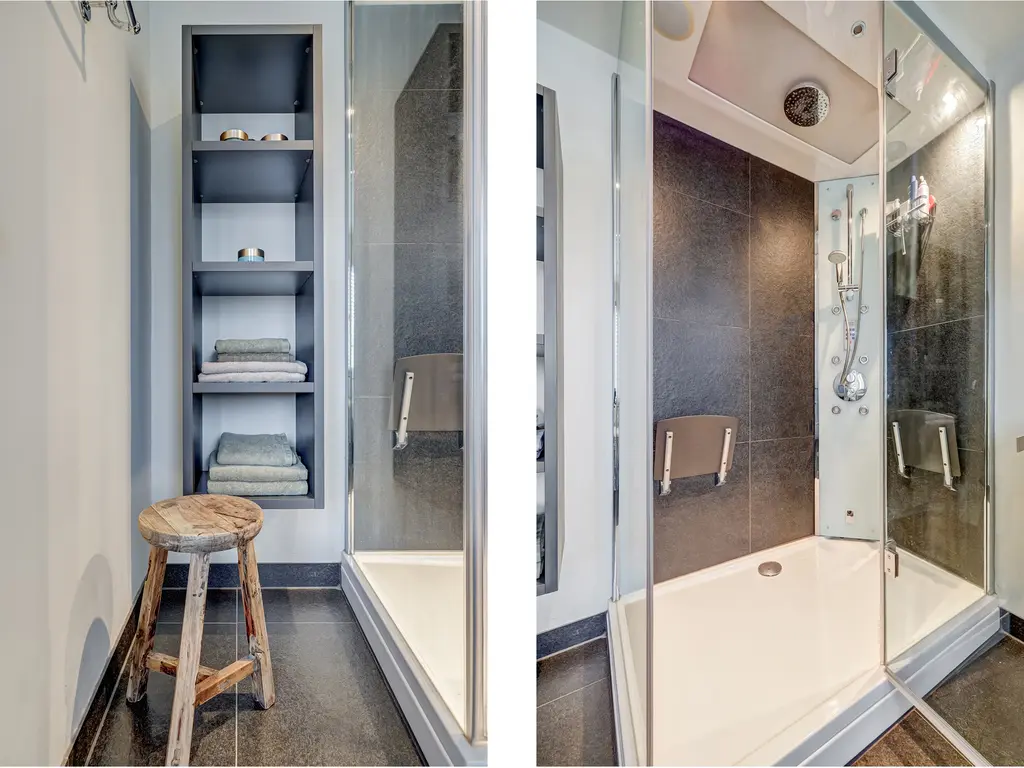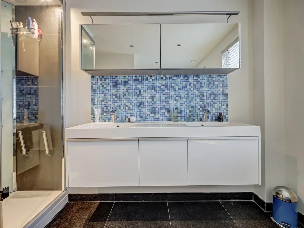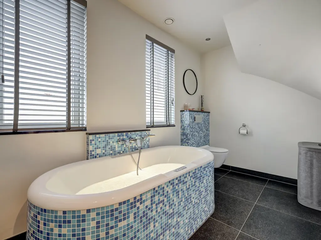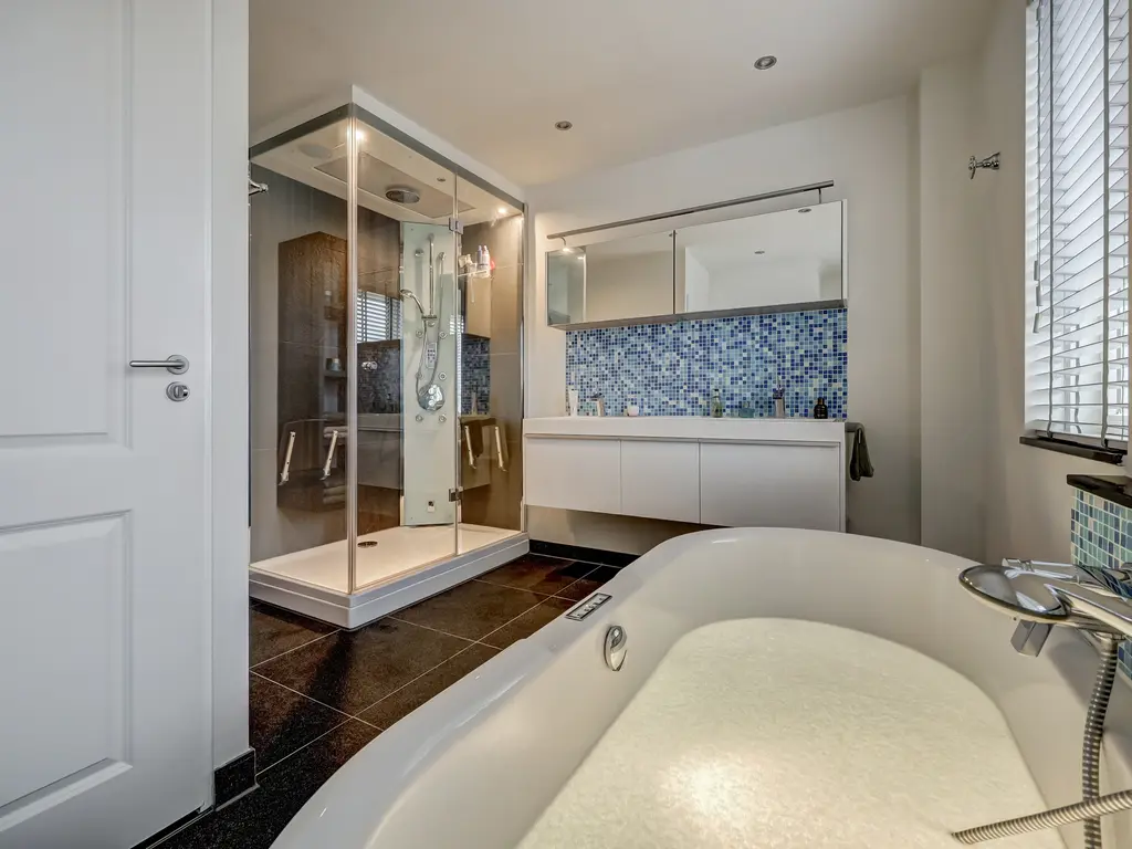 De moderne badkamer is een echte blikvanger met een vrijstaand whirlpoolbad, een stoom-combi douchecabine met stoomfunctie, een dubbele wastafel met meubel en een tweede toilet.
