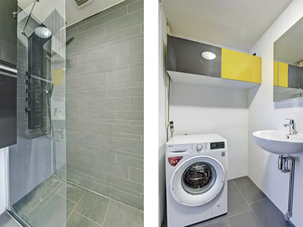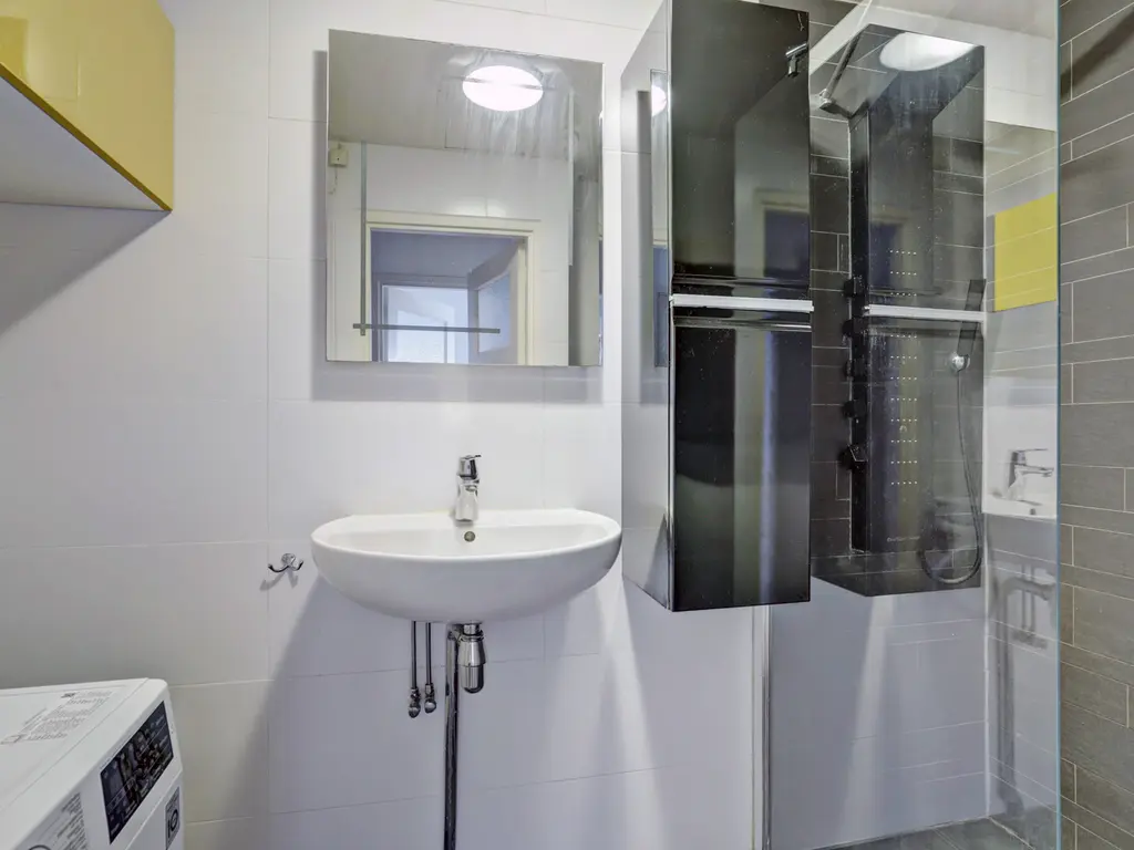 De ruime en lichte woonkamer heeft strak afgewerkte wanden en plafonds, een nette laminaatvloer en een heerlijk vrij uitzicht. Via de woonkamer stap je zo het ruime, zonnige balkon op het zuiden op: een fijne plek om te ontspannen. De geheel betegelde badkamer beschikt over een douche, wastafel en wasmachineaansluiting.