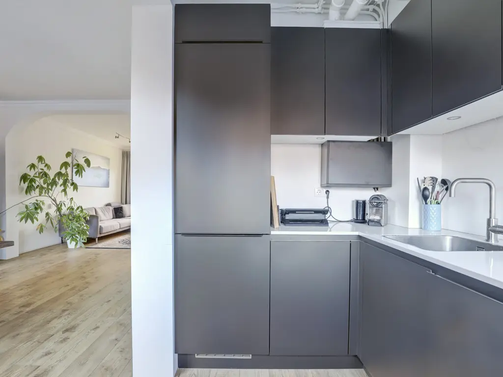 2e verdieping: Entree en hal met toegang tot alle vertrekken. Separaat toilet en praktische voorraadkast. De moderne zwarte keuken (2020) is voorzien van diverse inbouwapparatuur, waaronder een inductiekookplaat, combi-oven, vaatwasser, afzuigkap en koel-vriescombinatie. Vanuit de keuken is er toegang tot het balkon aan de voorzijde.