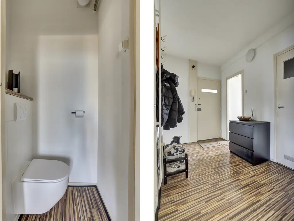Op de 4e verdieping stap je de woning binnen in een verzorgde hal met meterkast, modern zwevend toilet en een handige bergkast. De lichte woonkamer is direct een prettige verrassing: dankzij de grote ramen valt er veel daglicht binnen en geniet je van een vrij uitzicht over de wijk. De ruimte heeft een fijne indeling en een rustige uitstraling, waardoor je hier moeiteloos je eigen sfeer kunt creëren.
