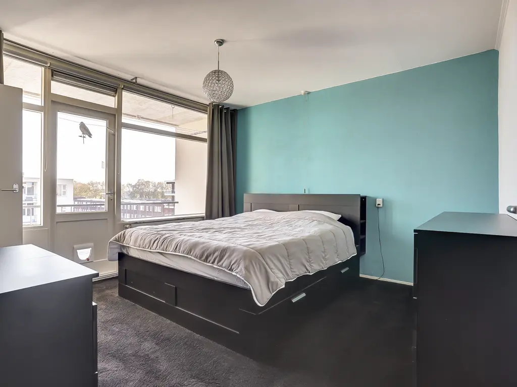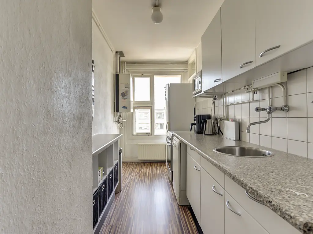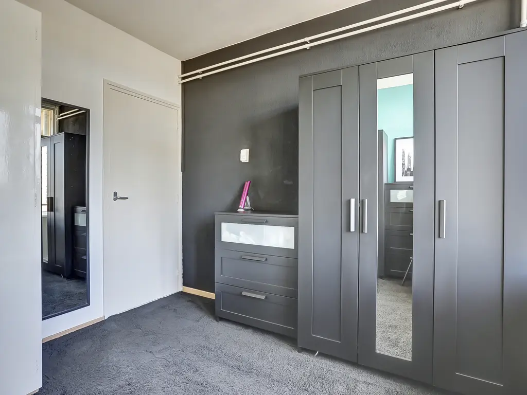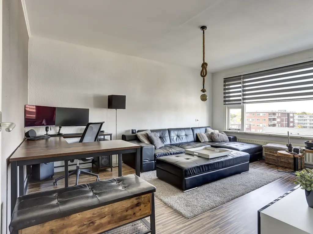 Op de 4e verdieping stap je de woning binnen in een verzorgde hal met meterkast, modern zwevend toilet en een handige bergkast. De lichte woonkamer is direct een prettige verrassing: dankzij de grote ramen valt er veel daglicht binnen en geniet je van een vrij uitzicht over de wijk. De ruimte heeft een fijne indeling en een rustige uitstraling, waardoor je hier moeiteloos je eigen sfeer kunt creëren.
