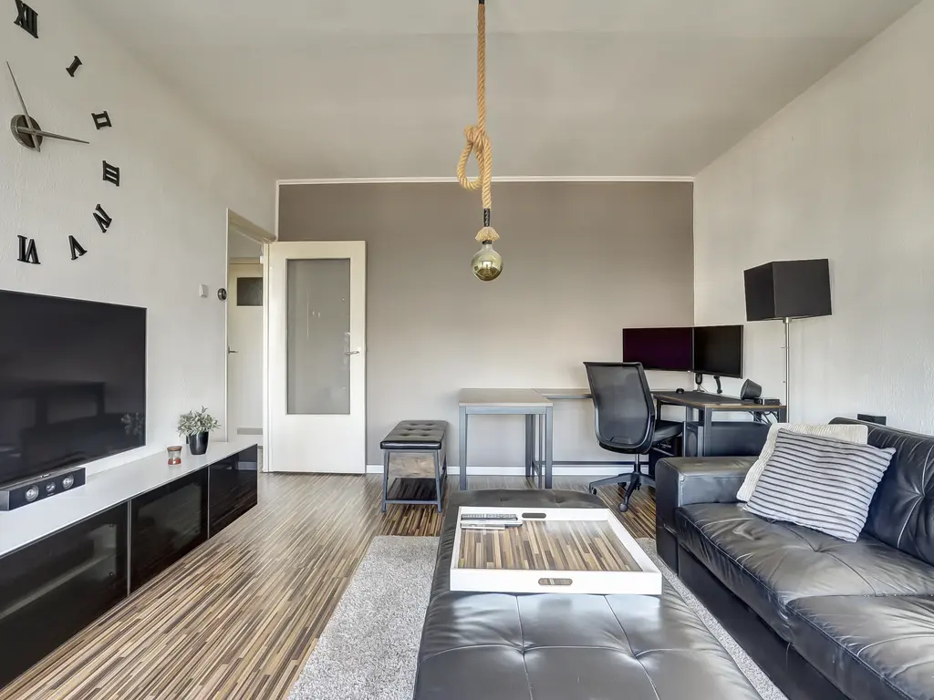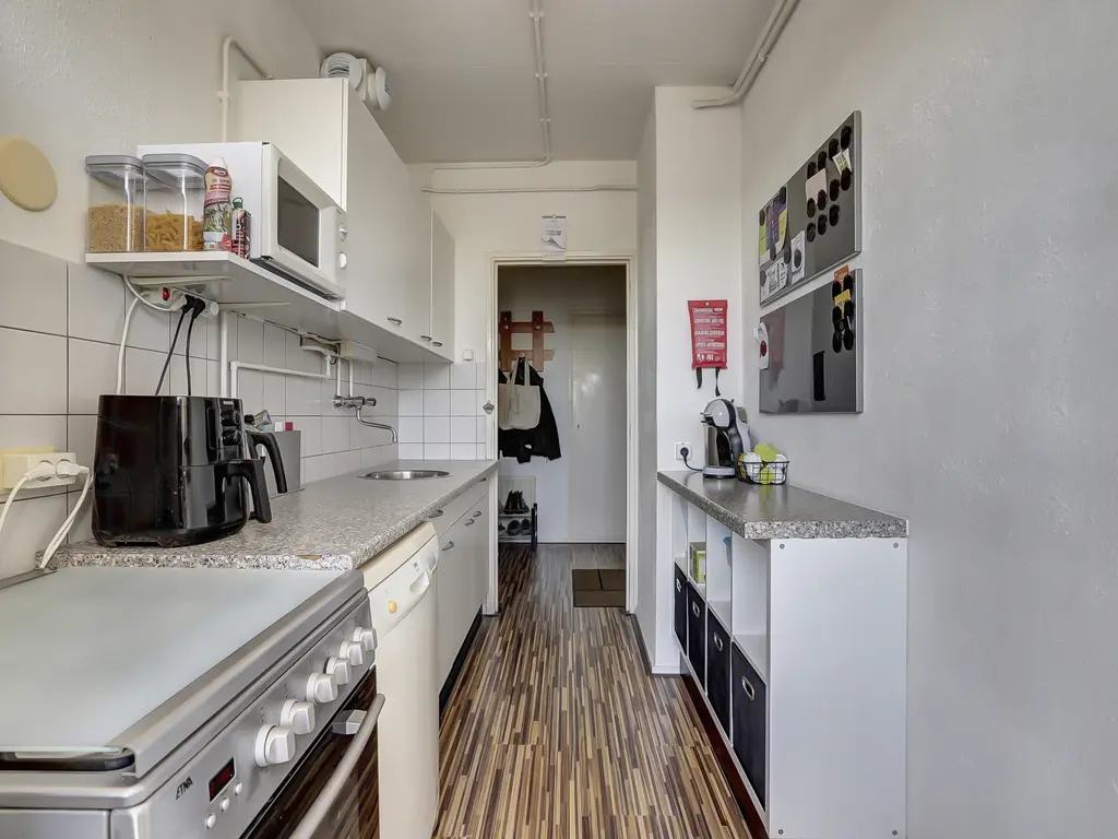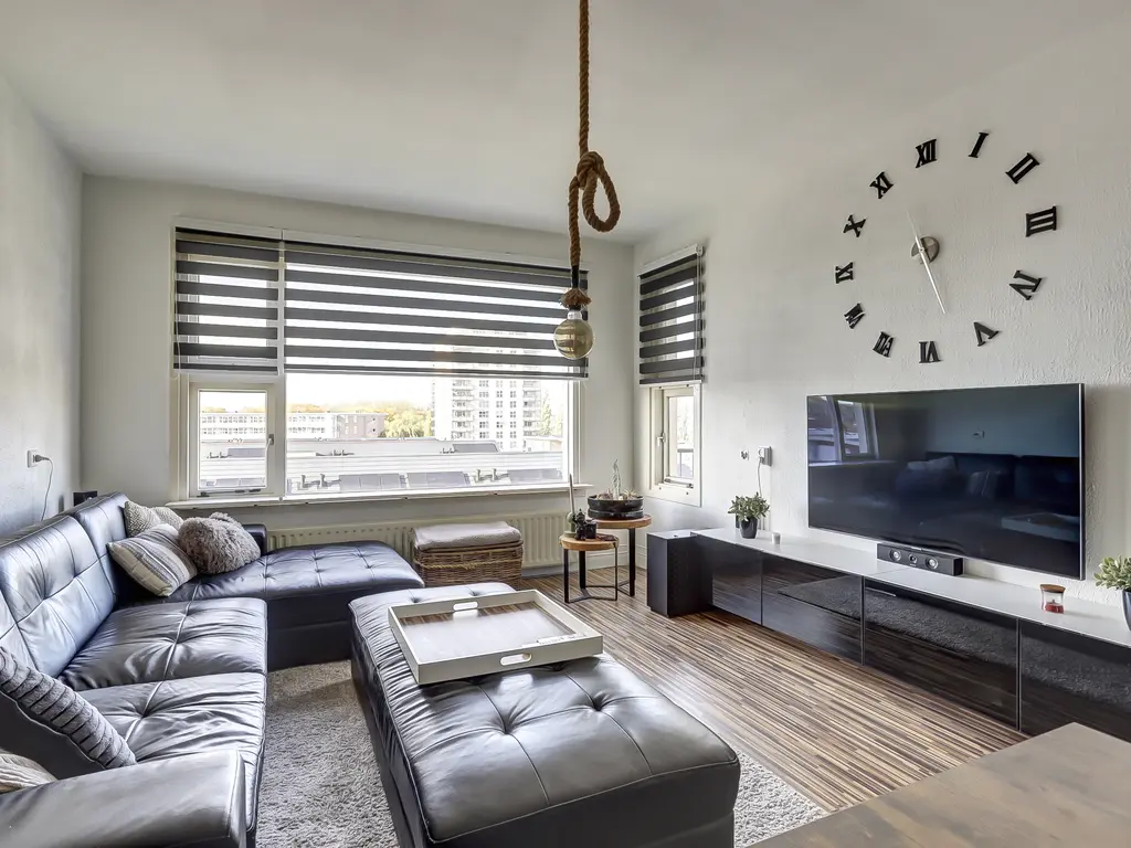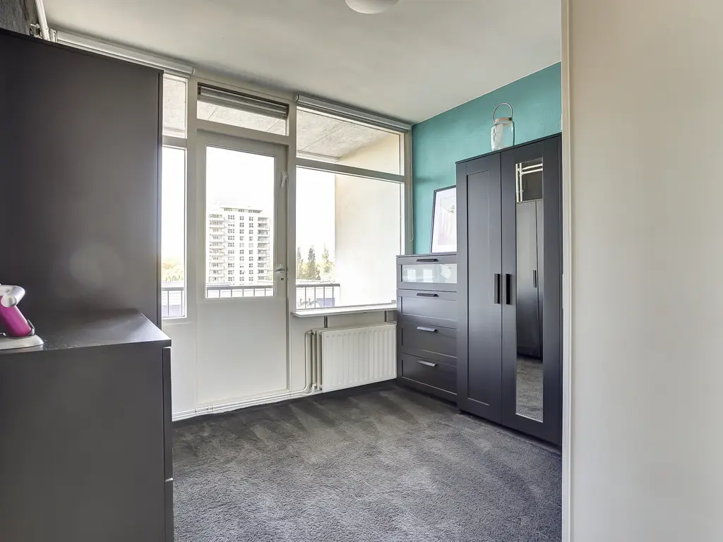 Op de 4e verdieping stap je de woning binnen in een verzorgde hal met meterkast, modern zwevend toilet en een handige bergkast. De lichte woonkamer is direct een prettige verrassing: dankzij de grote ramen valt er veel daglicht binnen en geniet je van een vrij uitzicht over de wijk. De ruimte heeft een fijne indeling en een rustige uitstraling, waardoor je hier moeiteloos je eigen sfeer kunt creëren.