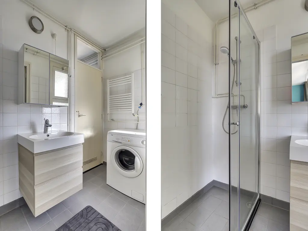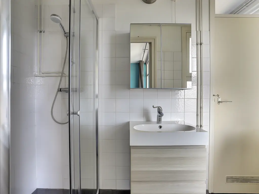 De badkamer (grotendeels gerenoveerd in 2025) is compact maar functioneel ingedeeld met een douchecabine, wastafelmeubel en aansluiting voor de wasmachine. De woning is grotendeels voorzien van een nette laminaatvloer en houten kozijnen, deels met dubbele beglazing.
