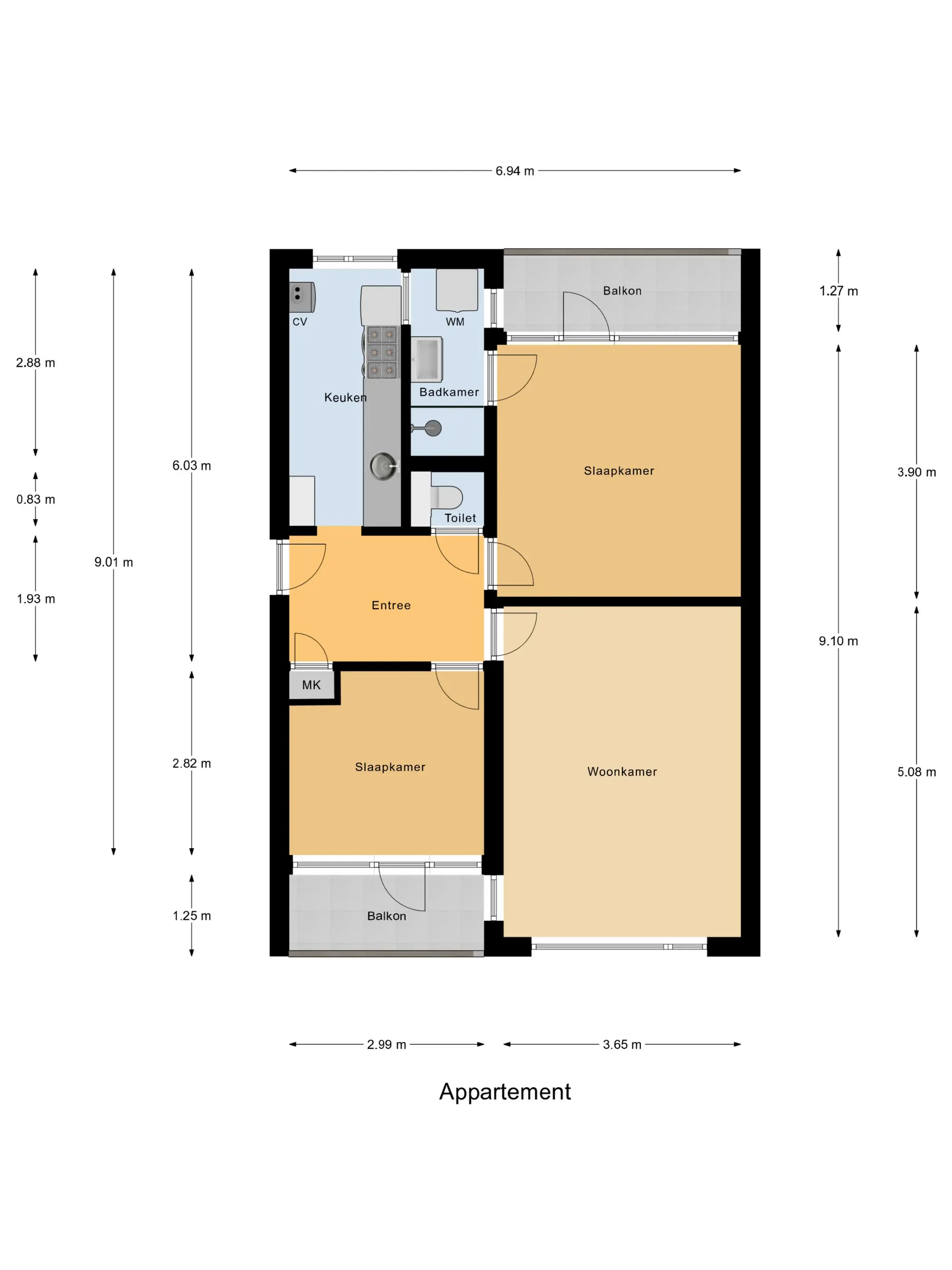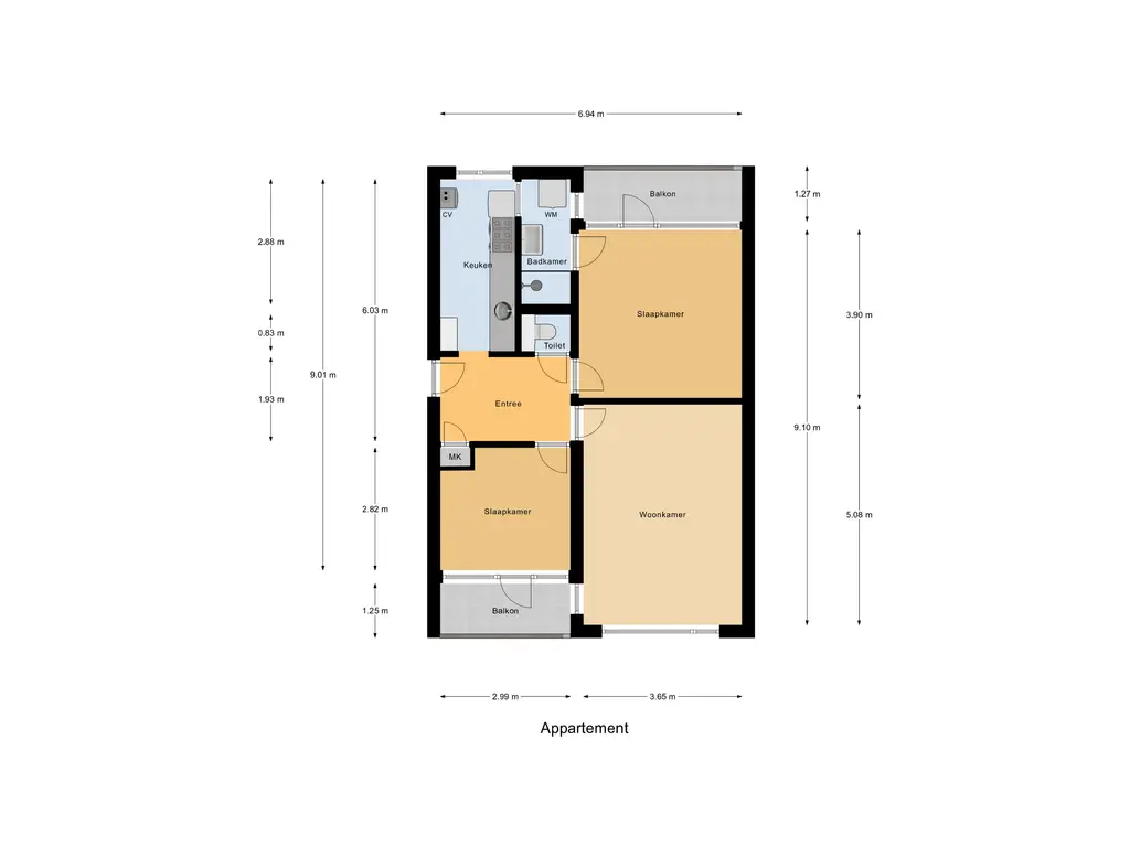 Het appartement beschikt over twee slaapkamers én toegang tot een eigen balkon. Het balkon aan de oostzijde vangt de eerste zonnestralen van de dag, terwijl je op het westbalkon heerlijk kunt genieten van de avondzon – zo heb je altijd een plekje in de zon.