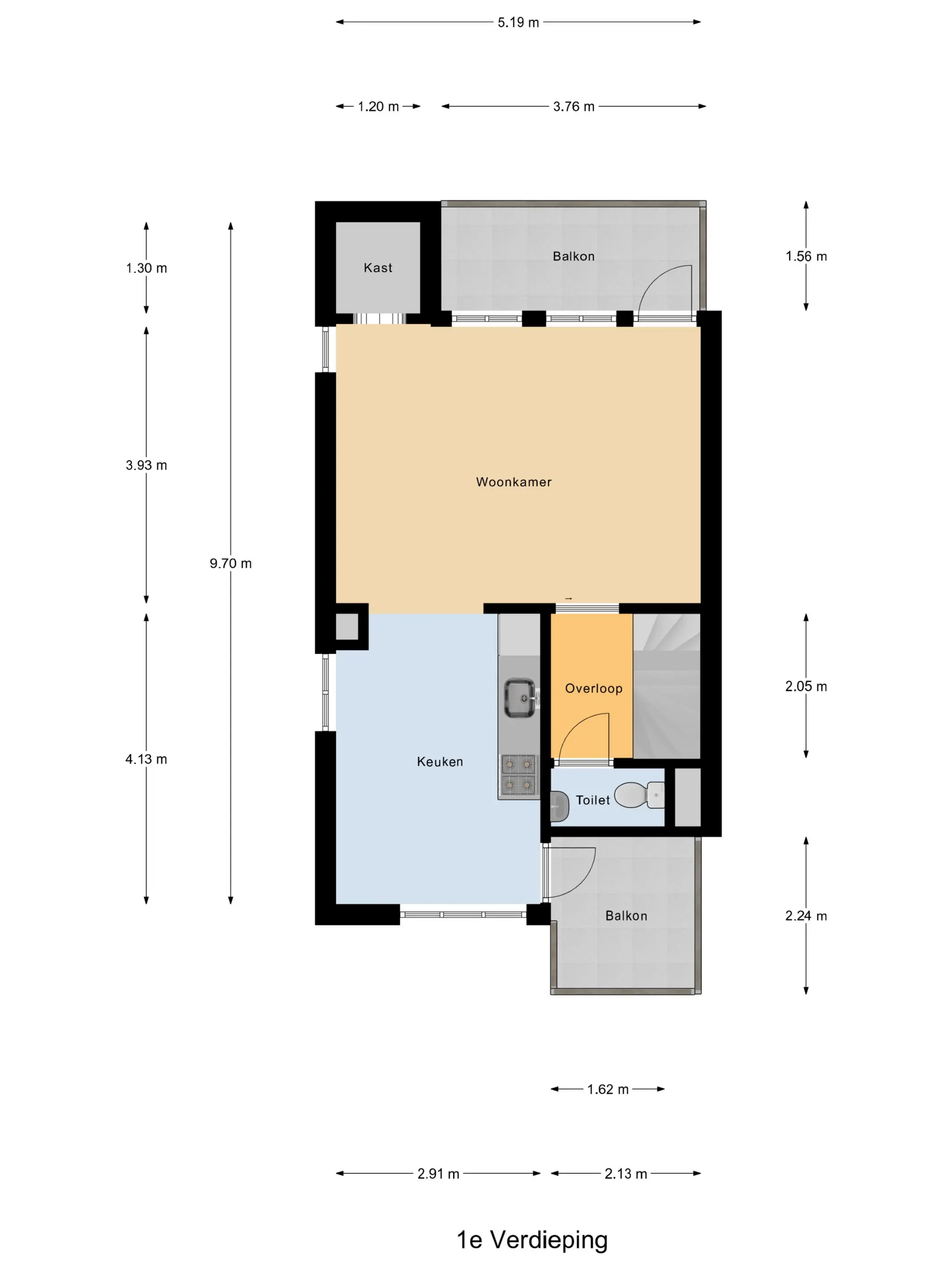 2e Verdieping: Vanaf de overloop bereik je het separate toilet, de woonkamer en de trap naar boven. De ruime L-vormige woonkamer van ca. 34 m² is heerlijk licht dankzij de hoekligging en biedt een prettige indeling met een aparte nis—ideaal als werkplek of speelhoek. Vanuit de woonkamer heb je toegang tot twee balkons, gelegen op het oosten én het westen, zodat je zowel van de ochtend- als avondzon kunt genieten.