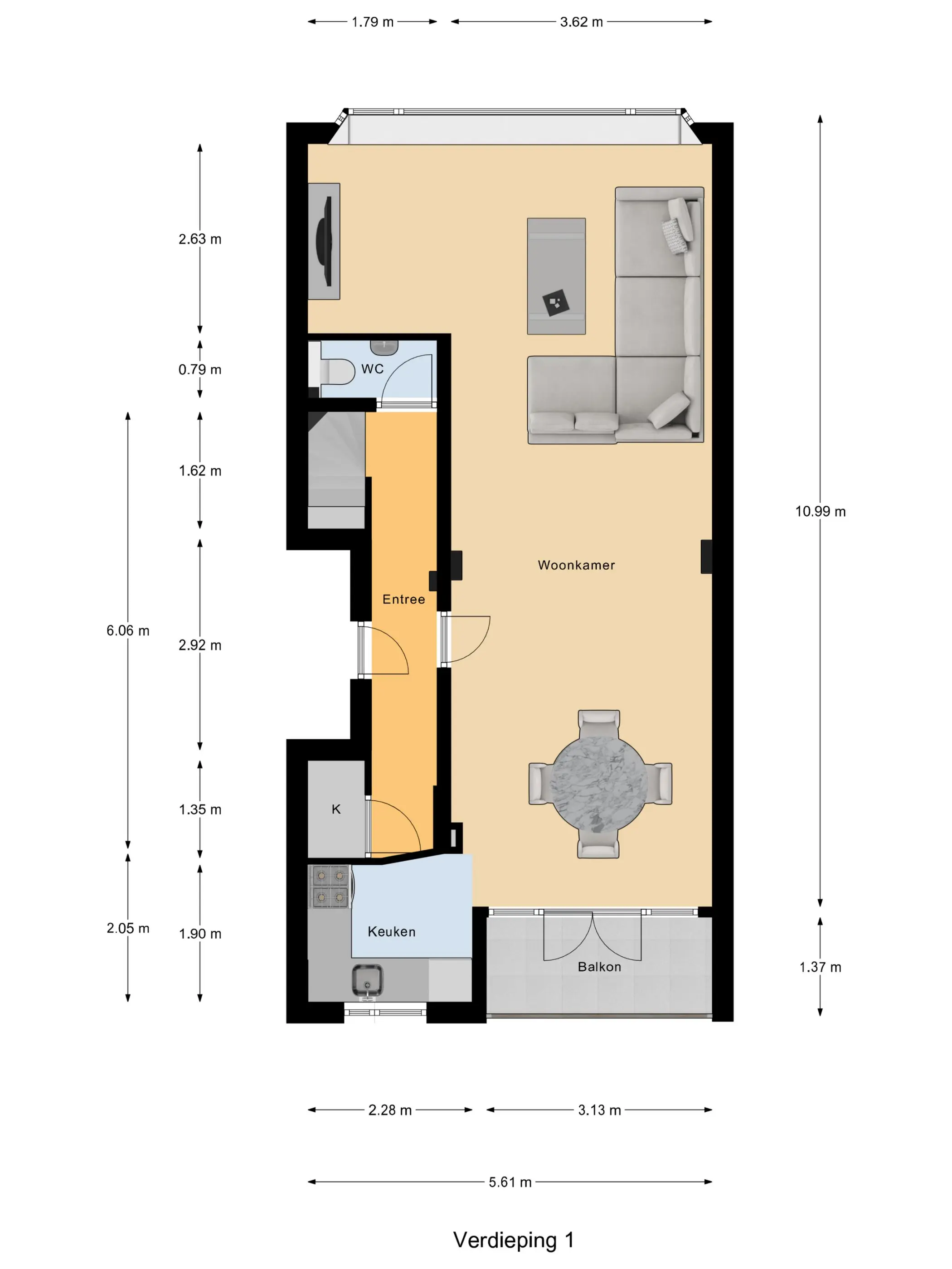2e verdieping: Via de ruime entree/hal met meterkast, zwevend toilet en trapopgang bereik je de woonverdieping.
