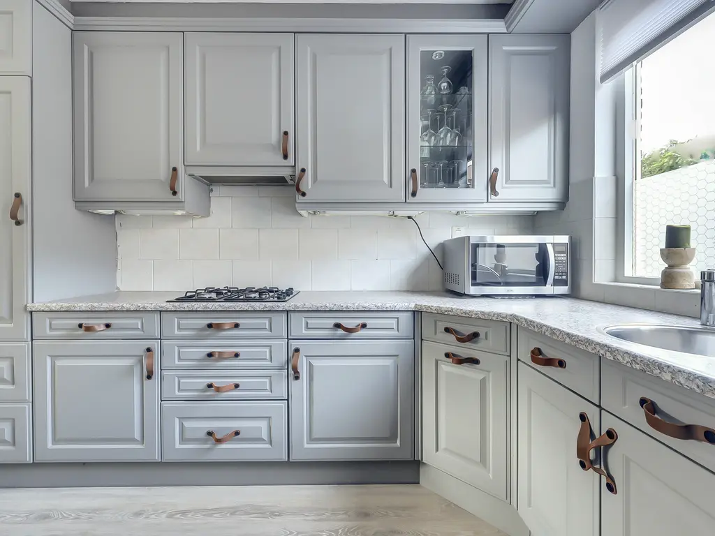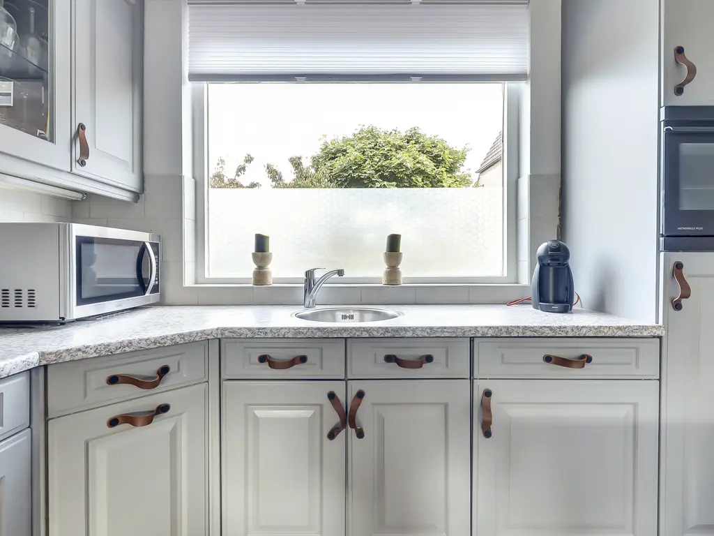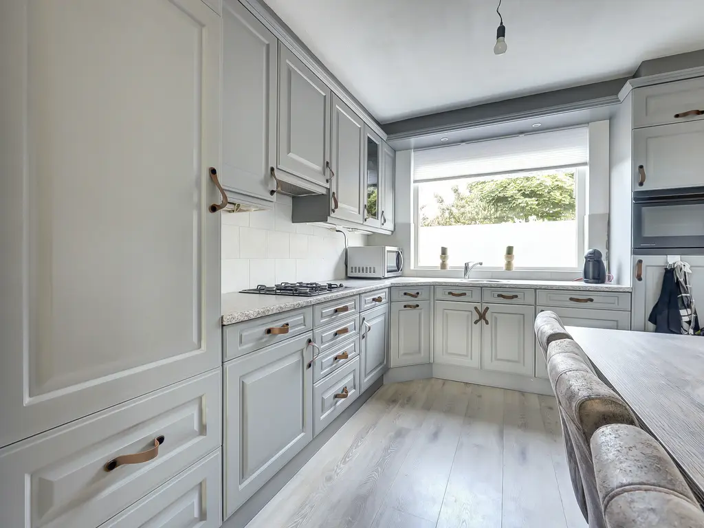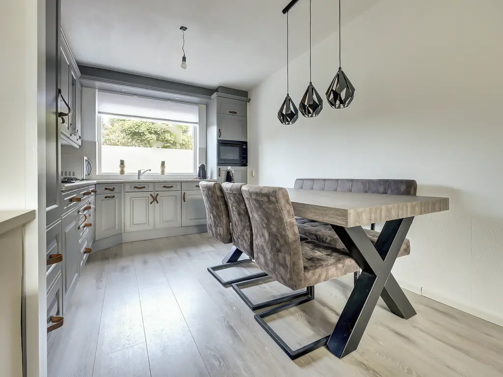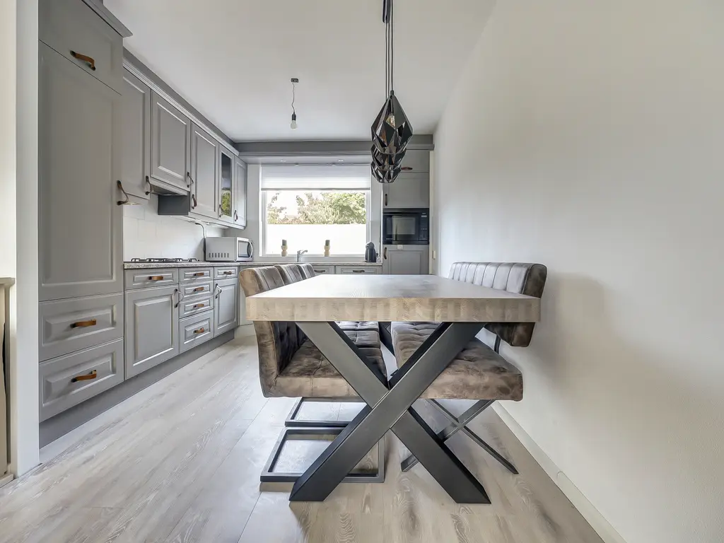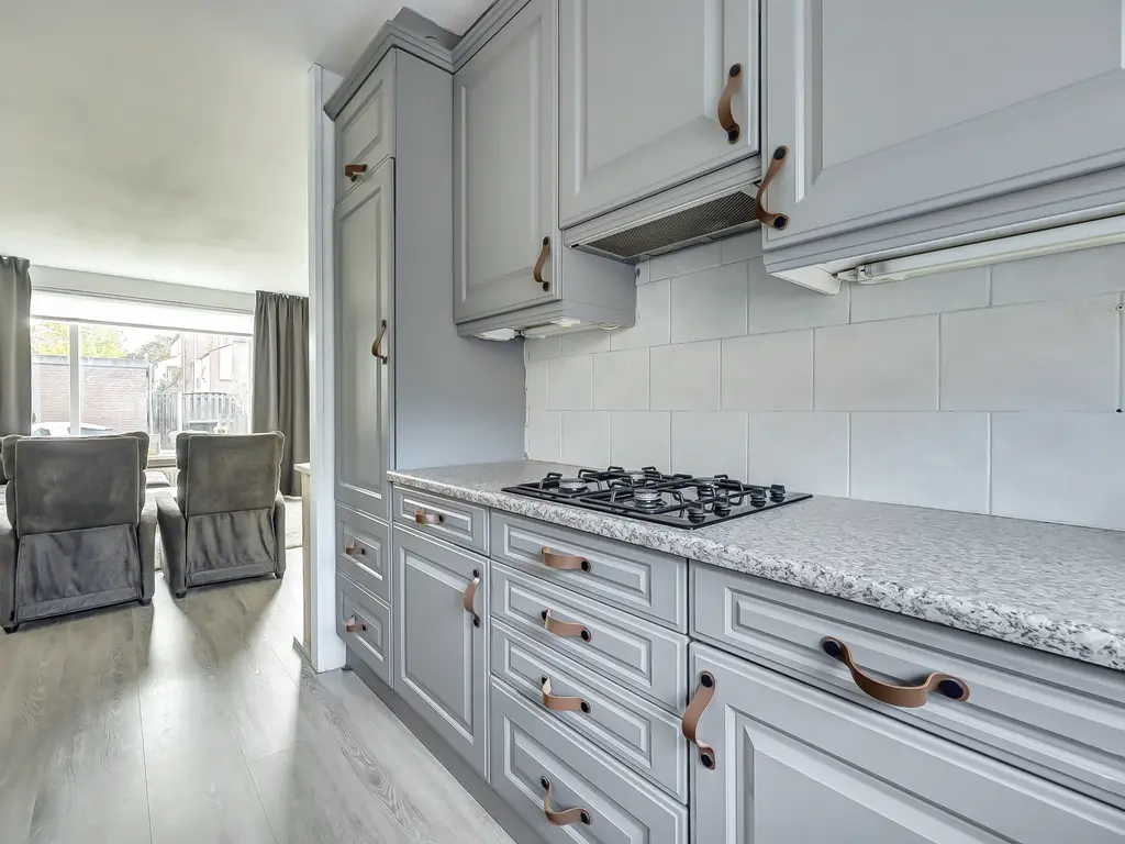 Aan de voorzijde ligt de keuken, uitgerust met o.a. een 4-pits gasfornuis, afzuigkap, combi-oven, vaatwasser, koel-vriescombinatie en een praktische close-in boiler.