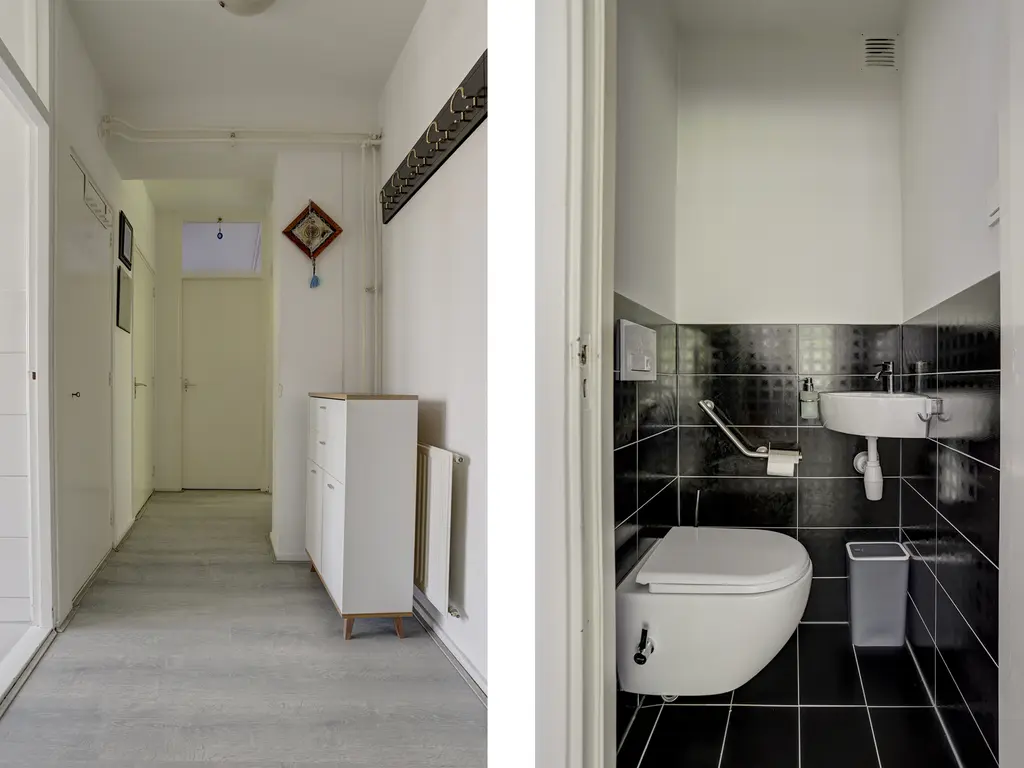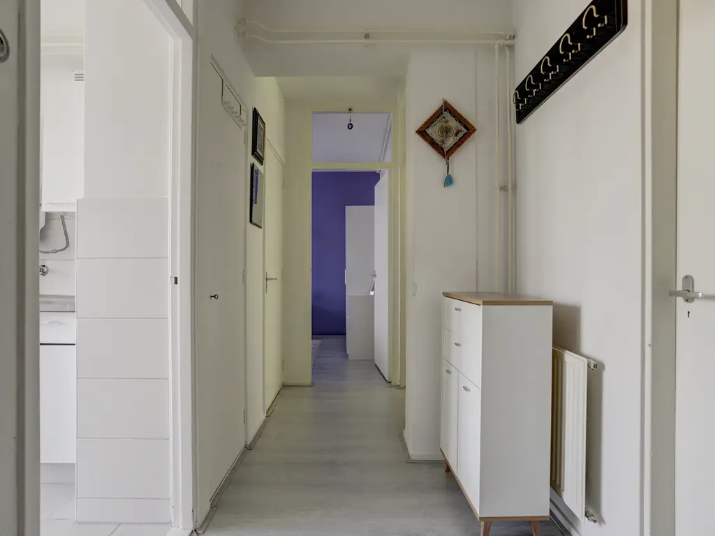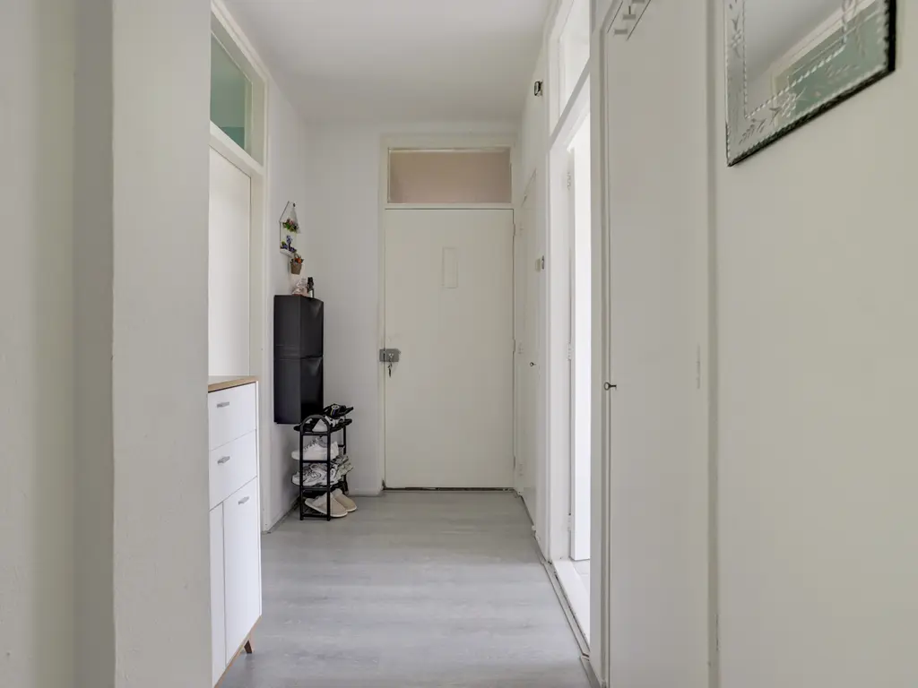 1e verdieping: Ruime hal/entree die toegang geeft tot de woonkamer, slaapkamers, modern toilet (2025), meterkast en de keuken. In de hal ligt een nette laminaatvloer, die is doorgelegd in de woonkamer en slaapkamers. Tevens beschikt de hal over een garderoberuimte en een vaste kast.
