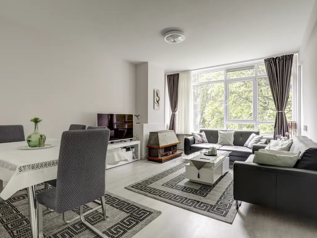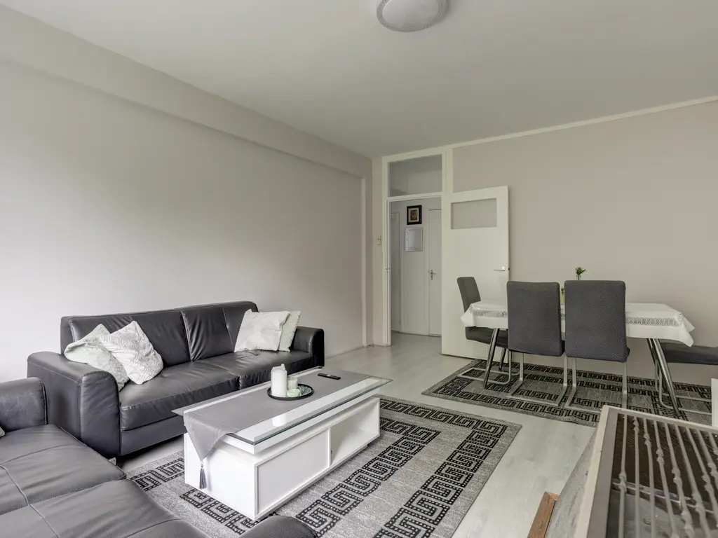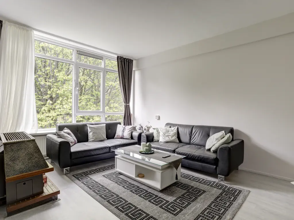 Woonkamer: De knusse woonkamer aan de achterzijde van het appartement van zo'n 21 m², is licht en biedt een fantastisch uitzicht op het 'Ruigeplaatbos'. De woonkamer is v.v. een laminaatvloer en een moederhaard.