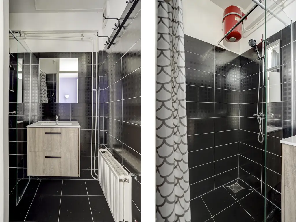 Badkamer: De moderne badkamer (2025) is tot bovenaan betegeld en v.v. een douche en wastafel met meubel.