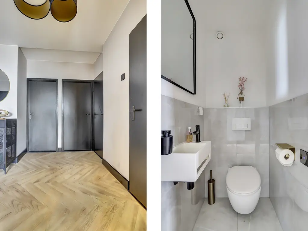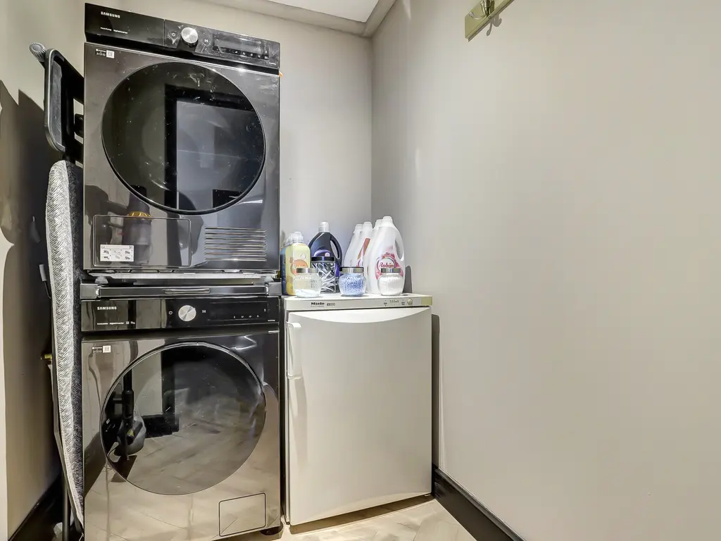 7e verdieping: Entree in een ruime hal met meterkast en toegang tot alle vertrekken. Er is een aparte toiletruimte met hangend toilet en fonteintje, uitgevoerd in een lichte kleurstelling met stijlvolle marmerlook tegels. Tevens is er een praktische wasruimte aanwezig.