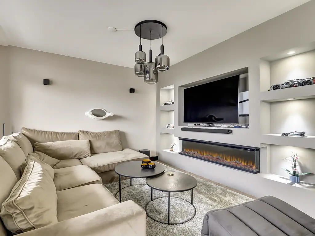 De royale living is een echte eyecatcher! Dankzij de open indeling voelt de ruimte licht en ruim aan en zijn er volop mogelijkheden voor een fijne zithoek én eethoek. De woonkamer is afgewerkt met een lichte visgraat laminaatvloer met hoge plinten, airconditioning, een Cinewall met sierhaard. De strakke afwerking met matzwarte details, zwarte kozijnen en netjes weggewerkte radiatoren geven het geheel een moderne en luxe uitstraling.