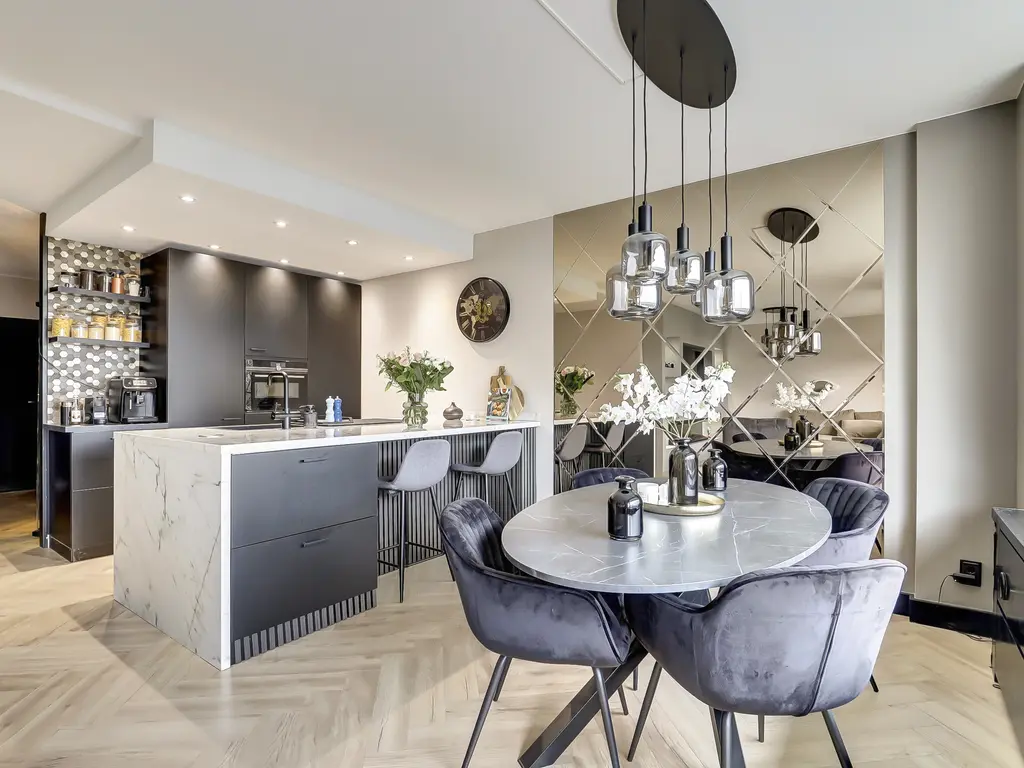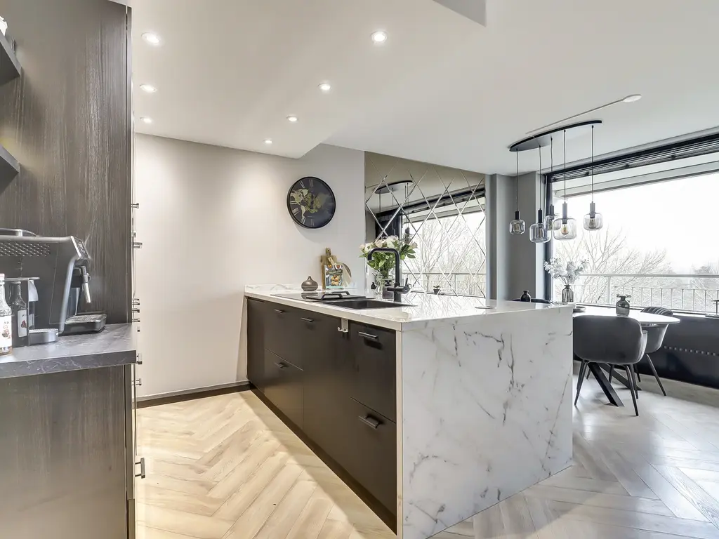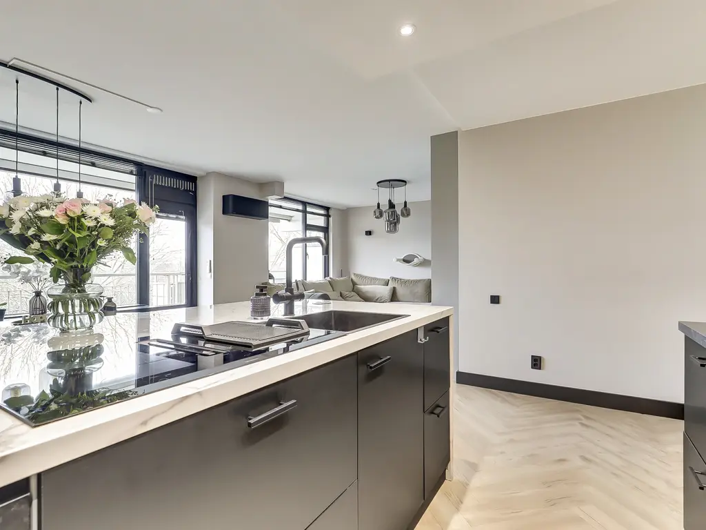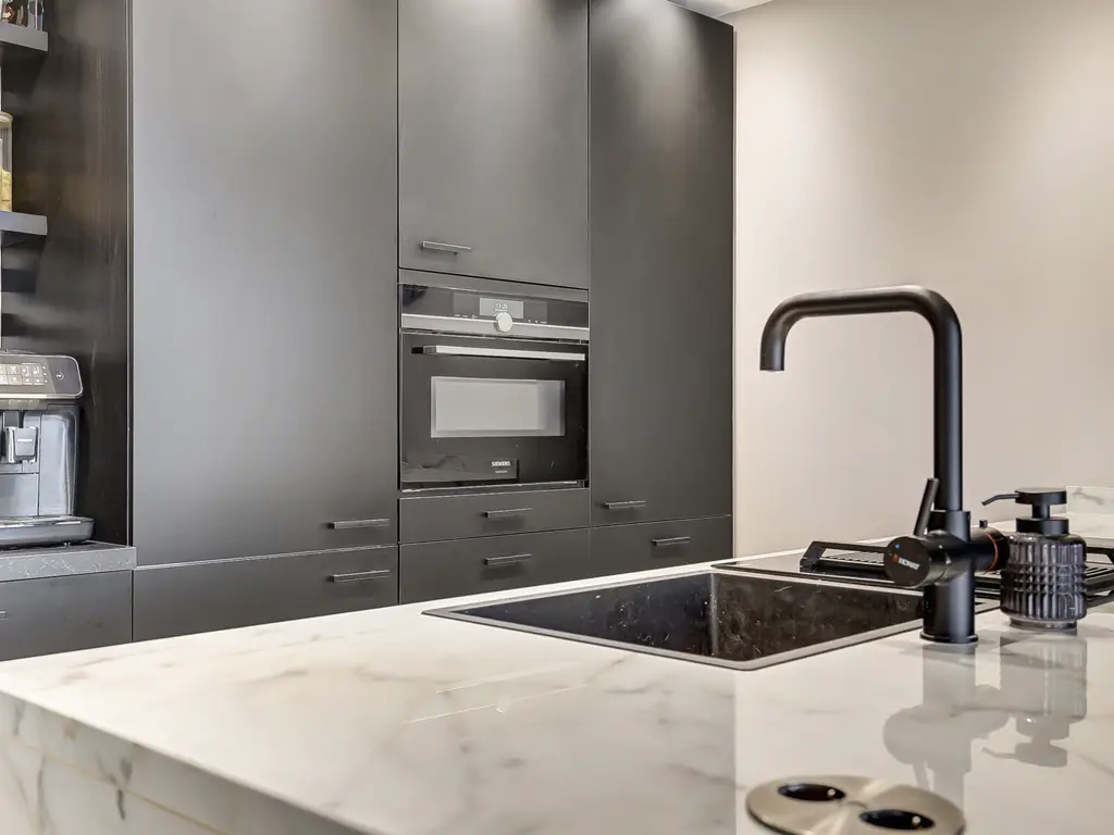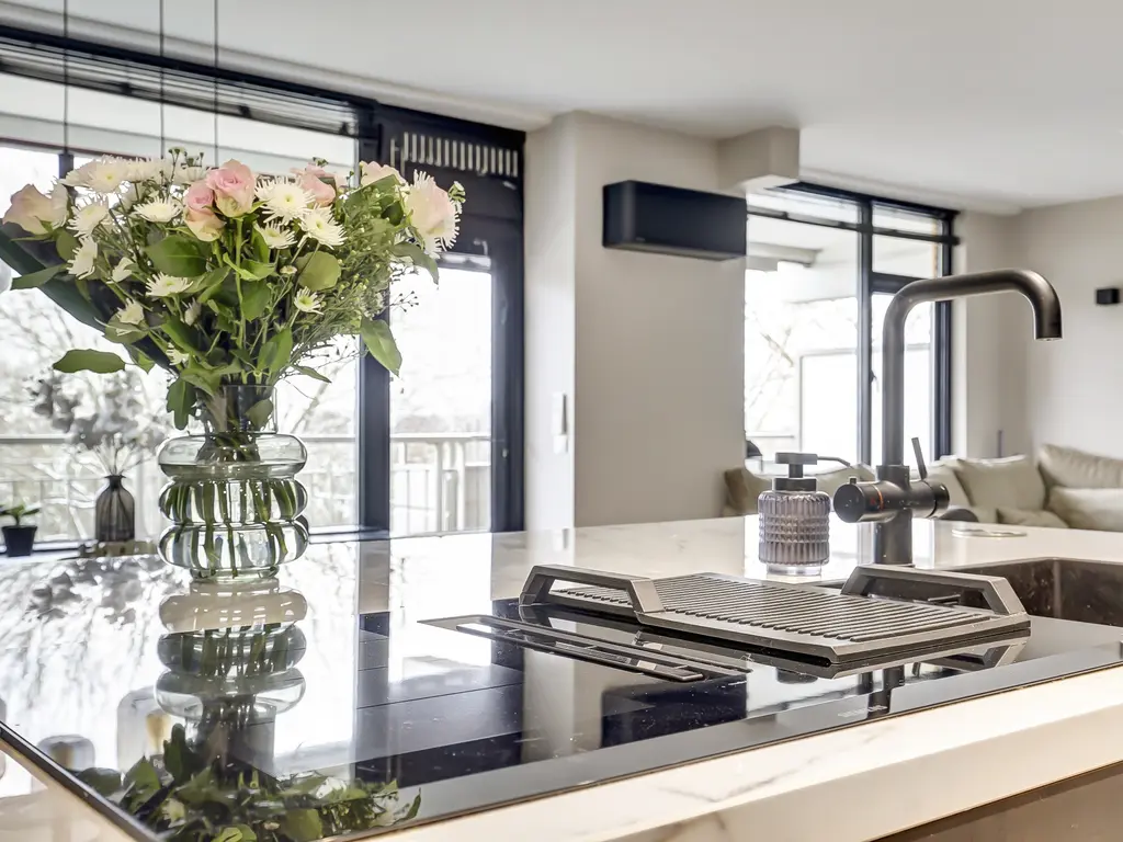 De open keuken met kookeiland is perfect voor kookliefhebbers en gezellige avonden. Het eiland beschikt over een ontbijtbar, een design spoelkraan, een inductiekookplaat met geïntegreerde afzuiging, vaatwasser en een koffiecorner. Verder is de keuken voorzien van diverse inbouwapparatuur zoals een koelkast, vrieskast en combi-oven/magnetron. Het marmerlook werkblad en ingebouwde spotjes maken het geheel compleet.
