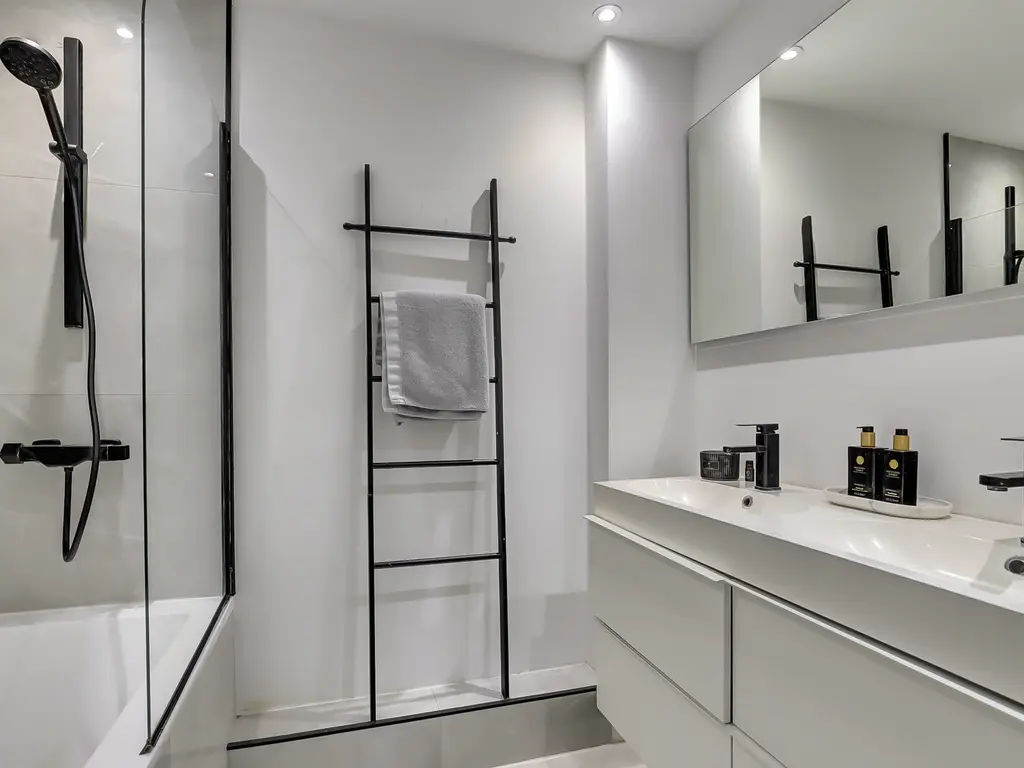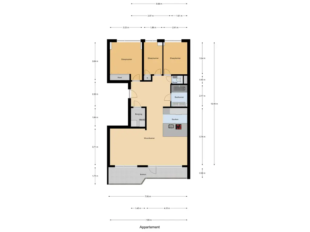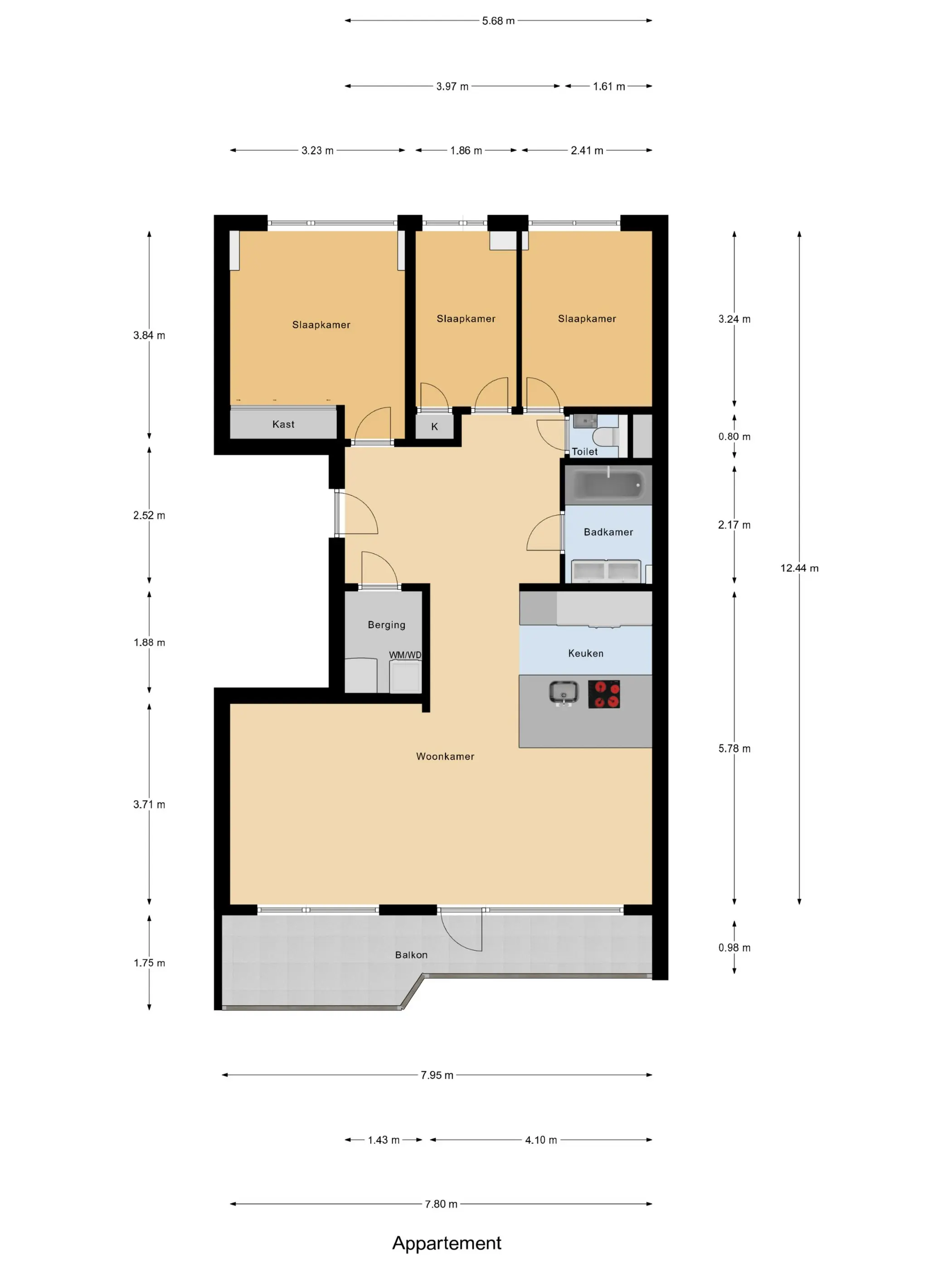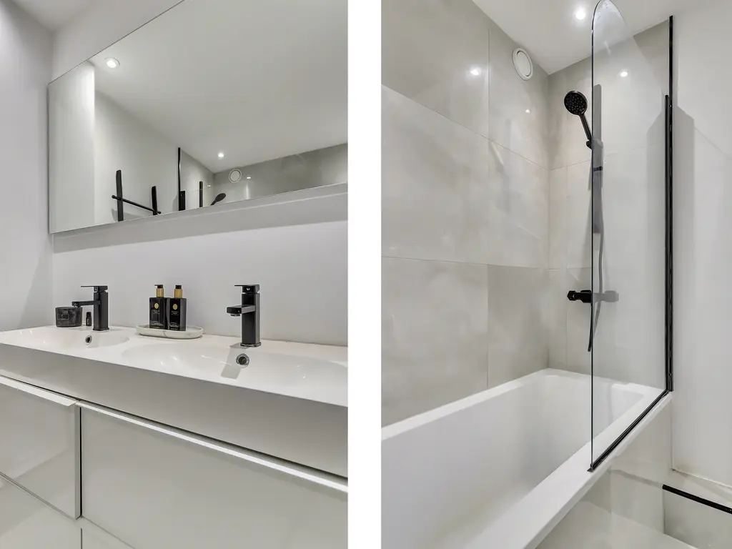 Het appartement beschikt over drie slaapkamers, allemaal gelegen aan de voorzijde. Slaapkamer 1 ca. 12 m², met handige schuifkastenwand. Slaapkamer 2 ca. 8 m². Slaapkamer 3 ca. 6 m², voorzien van een vaste kast. De moderne badkamer is strak en stijlvol uitgevoerd met marmerlook tegels en v.v. een dubbele wastafel met meubel, spiegel met verlichting en ligbad met douchescherm.